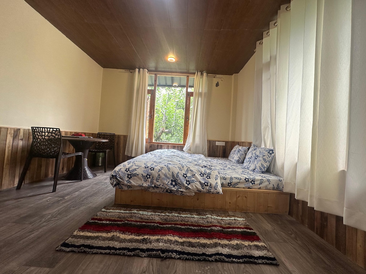 A true-blue working Apple orchard, barely 400 meters from the iconic & world-famous NAGGAR CASTLE, in a quaint little village called Chanalti. It is a rustic village set-up but fitted with all modern-day comforts - along with unending cups of herbal tea, coffee & stories to share! It is a place where the air is always fresh, the views are always stunning, and our hospitality is always homely, warm and welcoming! Min 2 Night Stay required! Pls. DO NOT book for 1 Night. STAGS NOT ALLOWED 🚫