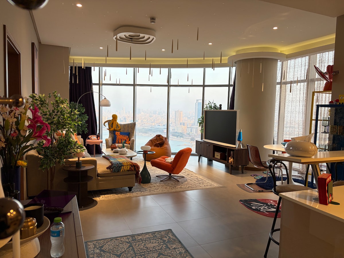Wake up to breathtaking sunsets and skyline views. Located on the 35th floor, this cozy and modern apartment combines warmth, style, and comfort with beautifully designed interiors and thoughtful touches. Located in the city of Manama, this modern space is less than 15 min from exploring the city’s vibrant culture, markets, waterfront cafés, cultural attractions, top restaurants, and lively nightlife. The apartment is above the noise of the city, and is perfect for a peaceful escape!