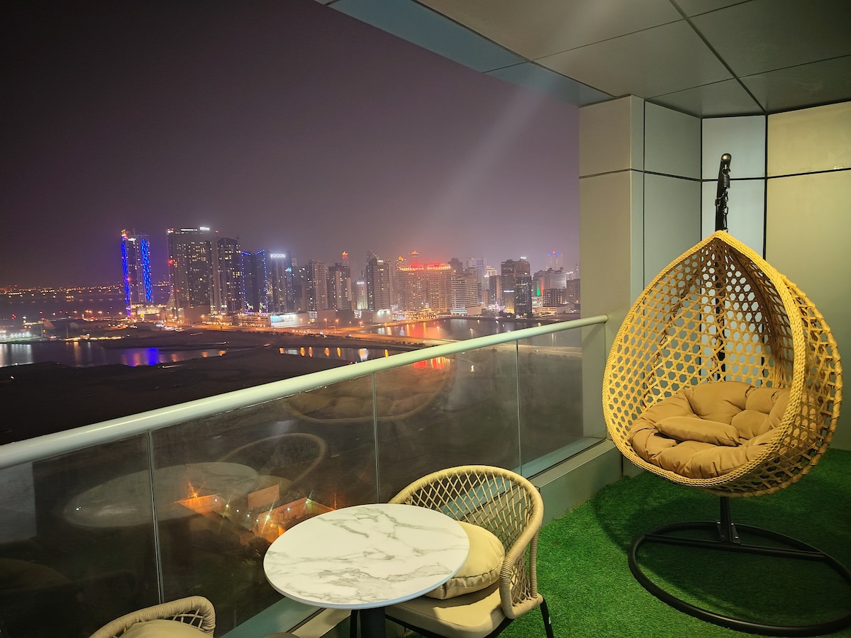 Kick back and relax in this cozy, stylish condo. The Condo 327 is a brand new sea + city view 1BR well-equipped apartment, with two private balconies w/outdoor swing, PS5, two smart TV’s (with Netflix), comfy feathered bedding, high-speed wifi, toiletries and fully-fitted kitchen on the 32nd floor of a gorgeous newly-built and secure building. Full access to all amenities; - Fitness center - Swimming pool - Sauna - Cinema - Squash court - 24/hr security.