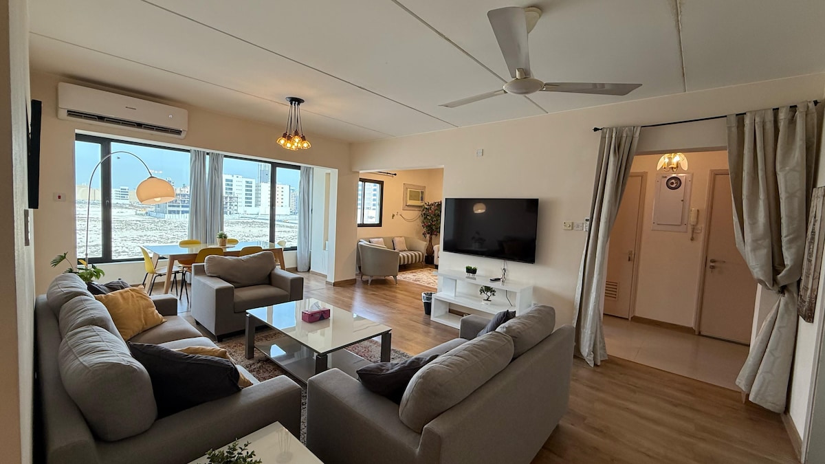 A great and spacious place with an amazing view. -5 minutes from Manama. -5 minutes from Al Seef District. -5 minutes from Bahrain Fort. ( historical landmark) -10 minutes from the Avenues Shopping Mall and Bahrain Gulf area. -Very easy access to the highway. -Carrefour and Lulu supermarkets only 3 minutes away. -Souk Alkhamees (Thursday Market) is a weekly local market 10 minutes walking distance or 2 minutes by car.