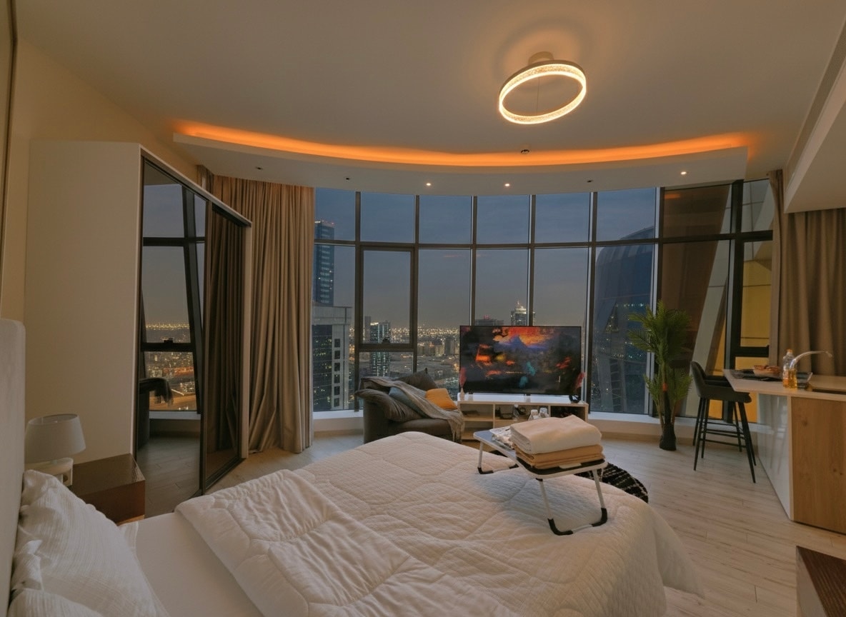 Wake up to breathtaking sunsets and skyline views. Located on the 35th floor, this cozy and modern apartment combines warmth, style, and comfort with beautifully designed interiors and thoughtful touches. Located in the city of Manama, this modern space is less than 15 min from exploring the city’s vibrant culture, markets, waterfront cafés, cultural attractions, top restaurants, and lively nightlife. The apartment is above the noise of the city, and is perfect for a peaceful escape!