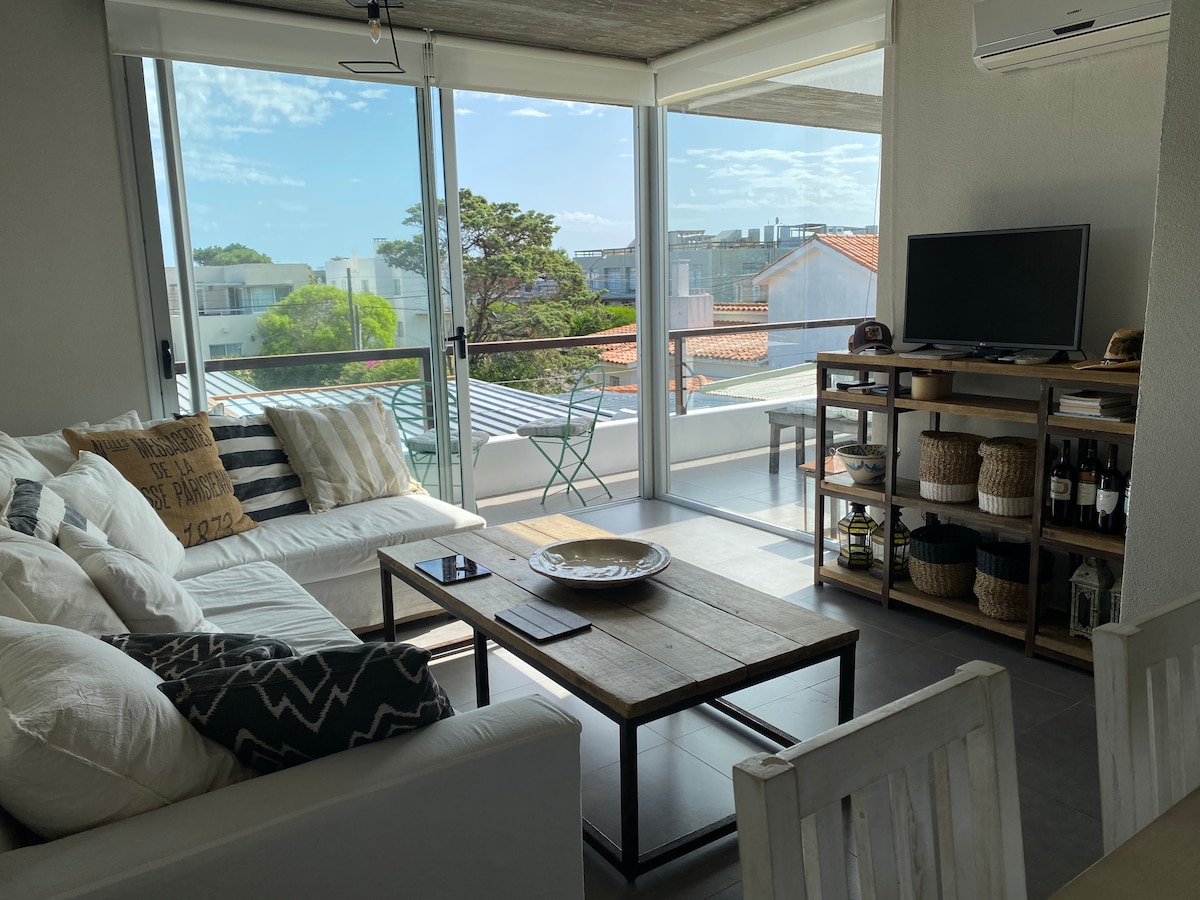 El apartamento cuenta con 2 dormitorios y 2 baños . Una sala amplia con cocina integrada y grandes ventanales que lo hacen muy iluminado . Se encuentra ubicado a 200 metros de la playa Bikini en un lugar muy tranquilo y panorámico pese a su cercanía a la playa y al centro de Manantiales que está a 100 metros. Hay varios restaurantes de diversos tipos de comida, bares, tiendas . Está a similar distancia de Punta del Este y de José Ignacio y a 2 kilómetros de La Barra. HAY SERVICIO DE MUCAMA