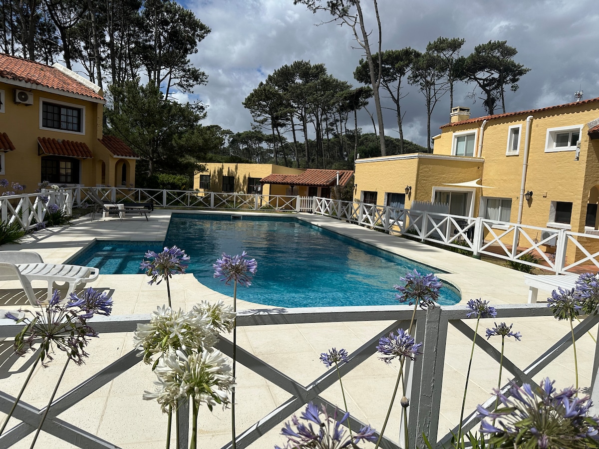 El apartamento cuenta con 2 dormitorios y 2 baños . Una sala amplia con cocina integrada y grandes ventanales que lo hacen muy iluminado . Se encuentra ubicado a 200 metros de la playa Bikini en un lugar muy tranquilo y panorámico pese a su cercanía a la playa y al centro de Manantiales que está a 100 metros. Hay varios restaurantes de diversos tipos de comida, bares, tiendas . Está a similar distancia de Punta del Este y de José Ignacio y a 2 kilómetros de La Barra. HAY SERVICIO DE MUCAMA