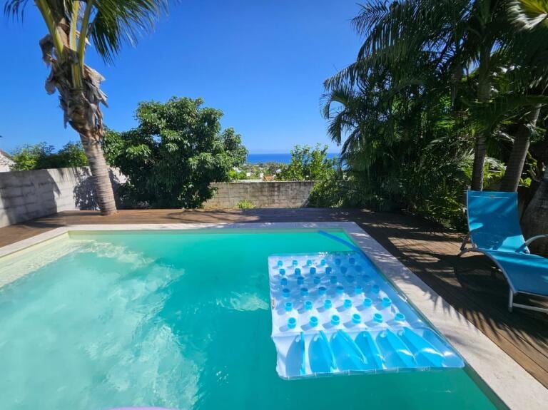 À Manapany les bains 🌊 5 min à pied du bassin de baignade de Manapany! Le logement entier, complètement indépendant avec son portail, place de parking , magnifique jardin. Avec une vue sur la mer 🌊 et la montagne ⛰️ Piscine chauffée avec coin jacuzzi, terrasse ouverte et couverte 🫧 Un grand lit double et canapé convertible très confortable et un berceau si besoin. Parking, wifi, espace détente