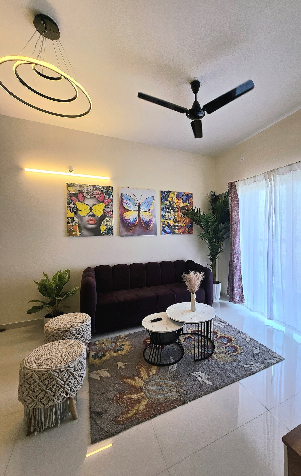 Wake up to stunning sunrise views at The Cozy Cove, a serene retreat in Pune’s Blue Ridge Township. This modern, fully-furnished apartment features a cozy sofa cum bed, a restful bedroom with soft linens, and elegant interiors designed for comfort and style. Enjoy Netflix and chill nights on the smart TV, a serene balcony setup, and a sleek modular kitchen equipped for all your needs. Perfect for couples or small families, it’s a peaceful escape with all the conveniences of home.