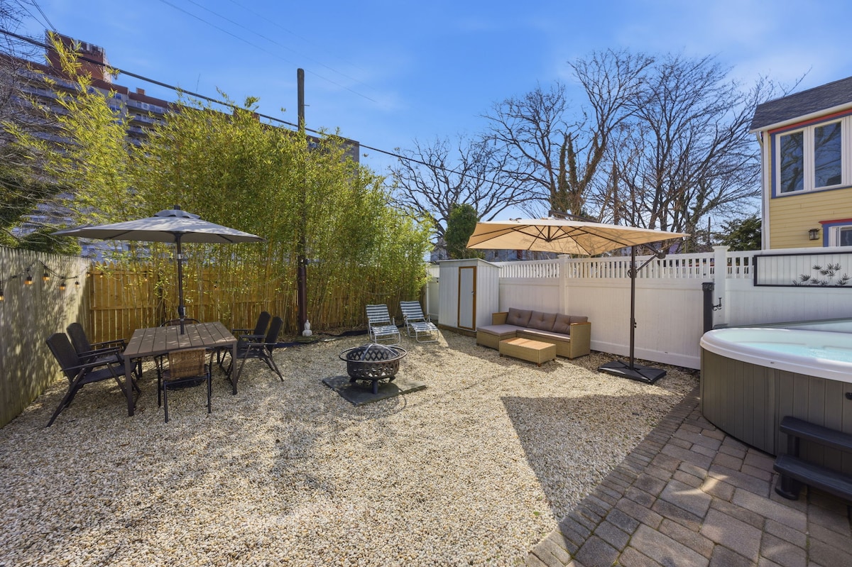 The perfect beach getaway! 5 short blocks to the ocean. 2 bedroom private apartment in Belmar home. A moments walk to Main St shops & restaurants. Loaded with amenities: Washer/Dryer. Outdoor Shower. Propane Grill. Fire Pit. Games. Spacious fenced yard. Fast Wi Fi. On Site Parking For 2 Cars and a heated swim spa