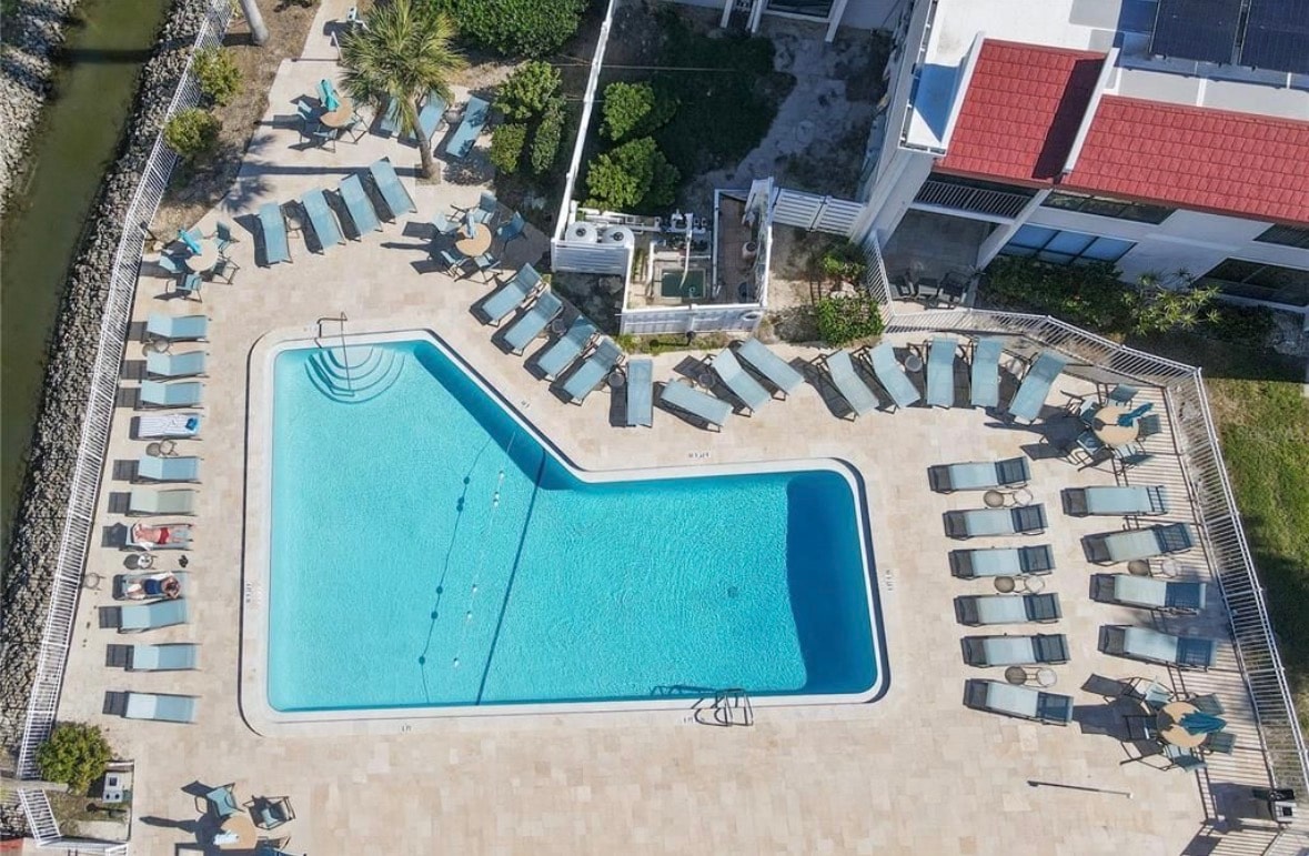 This is a recently renovated honeymoon suite located directly across from the big end of Siesta Key. It is an elegant ground floor pool unit. This unit is equip with marble countertops, tigers eye, lapis lazuli tables, bladeless ceiling fan, alabaster lighting and giant TVs. All of the appliances are stainless/smart and the microwave can cook steaks. There is a gym. The geographic location on the key can not be beat! There is a floating television over the California King luxury memory foam bed.