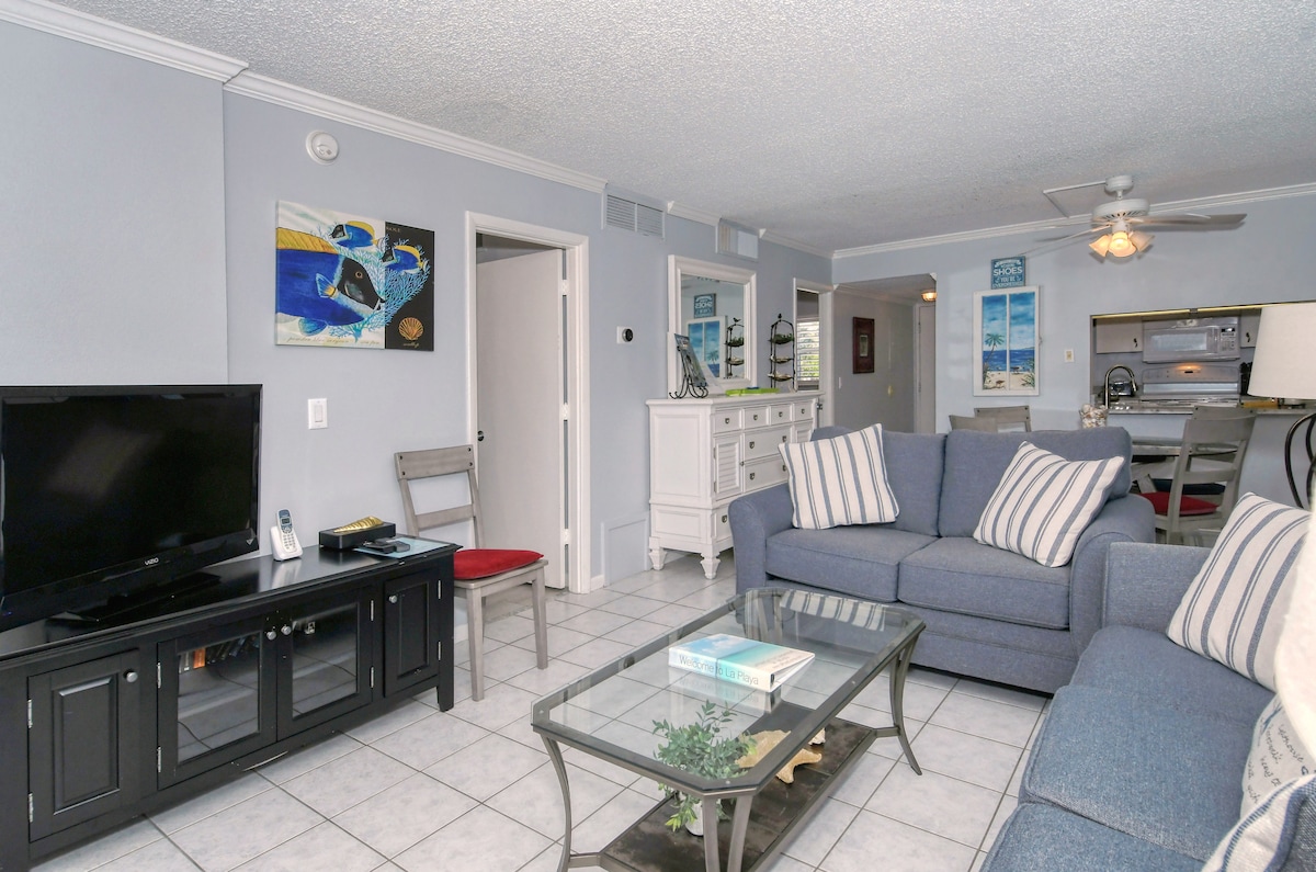 This is an updated and renovated two bedroom suite on Siesta Key. Complete with marble dining table, stainless appliances and large televisions. There is a computer in the spare bedroom for your convenience along with an Xbox and DVD player. We tried to think of everything so please feel free to make suggestions after your stay. Your satisfaction is our number one concern. The sofa is a Laz-Y-Boy and is not a sleeper but is very comfortable!!! There is a set of twin-twin bunks in the main room!