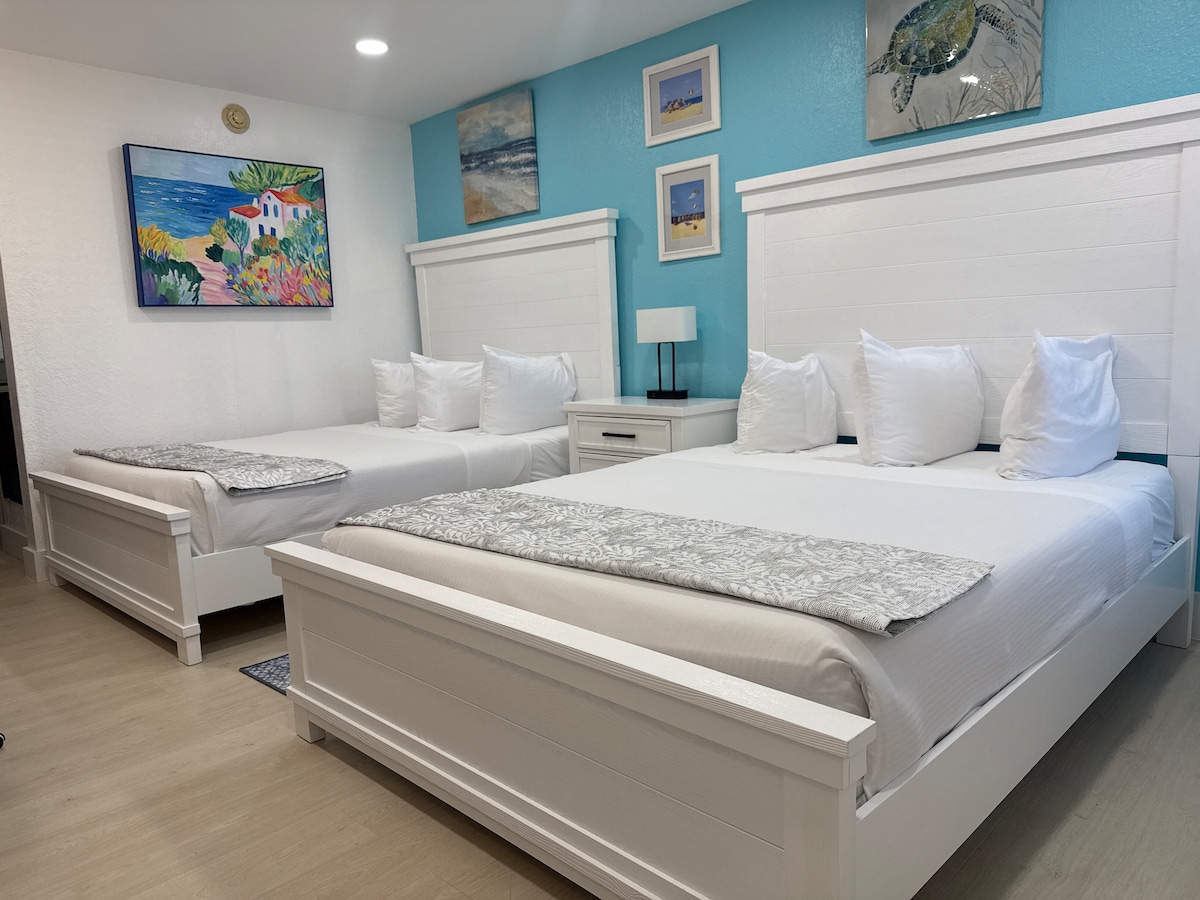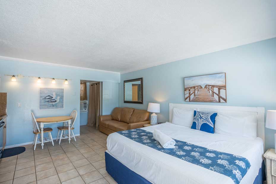 The Studio Suite at our Siesta Key hotel sleeps 1-2. Each room features a king-sized bed, 42-inch TV, dining table as well as a fully stocked stainless steel kitchenette. Perfect for couples or solo travelers. All of our rooms have recently been updated to be as attractive as they are comfortable. The King Studio Suites are furnished in a stylish seaside decor, including a comfortable patio with chairs and umbrella to relax and enjoy the wonderful weather that South Florida has to offer.