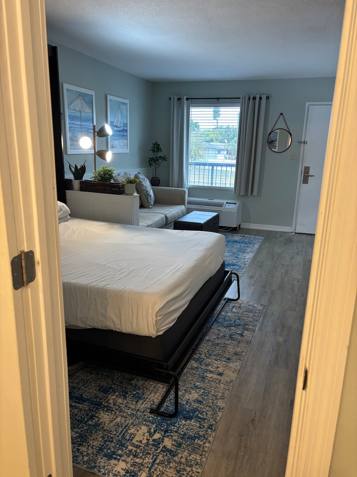 All-NEW - WATERFRONT Hotel Room-Condo located within the Ramada Inn on 41. Ground-floor, One comfy Queen bed with pullout couch. Smart TV w/ cable, strong WIFI. Stylish Interior, Vanity, Coffee/Tea bar w/ fridge and microwave. Heated Pool, Tiki Bar and Grill with daily meal and drink specials. Live music too! Beautiful Marina steps from your door...Bring your boat,rent one! Minutes drive to SRQ airport, USF, New College, IMG Academy, Downtown Sarasota, St. Armand's Circle & All area beaches!