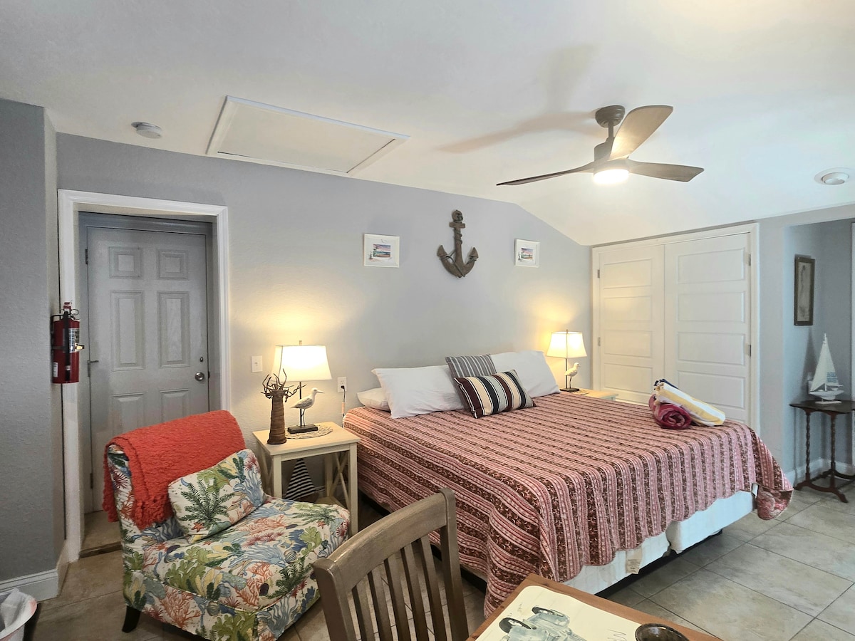 Palm Tree Villas offers a portfolio of unique 1950's resort rooms ranging from small studios to three bedroom villas with three bathrooms. We would love to host you for a wonderful quaint enjoyable vacation. Conveniently close to the trolley line for a quick bite at many great eating spots around the island and close enough to walk to the beach in two minutes. Park your car and enjoy the island. This offering is a small studio that is extremely popular. Two studios are available.