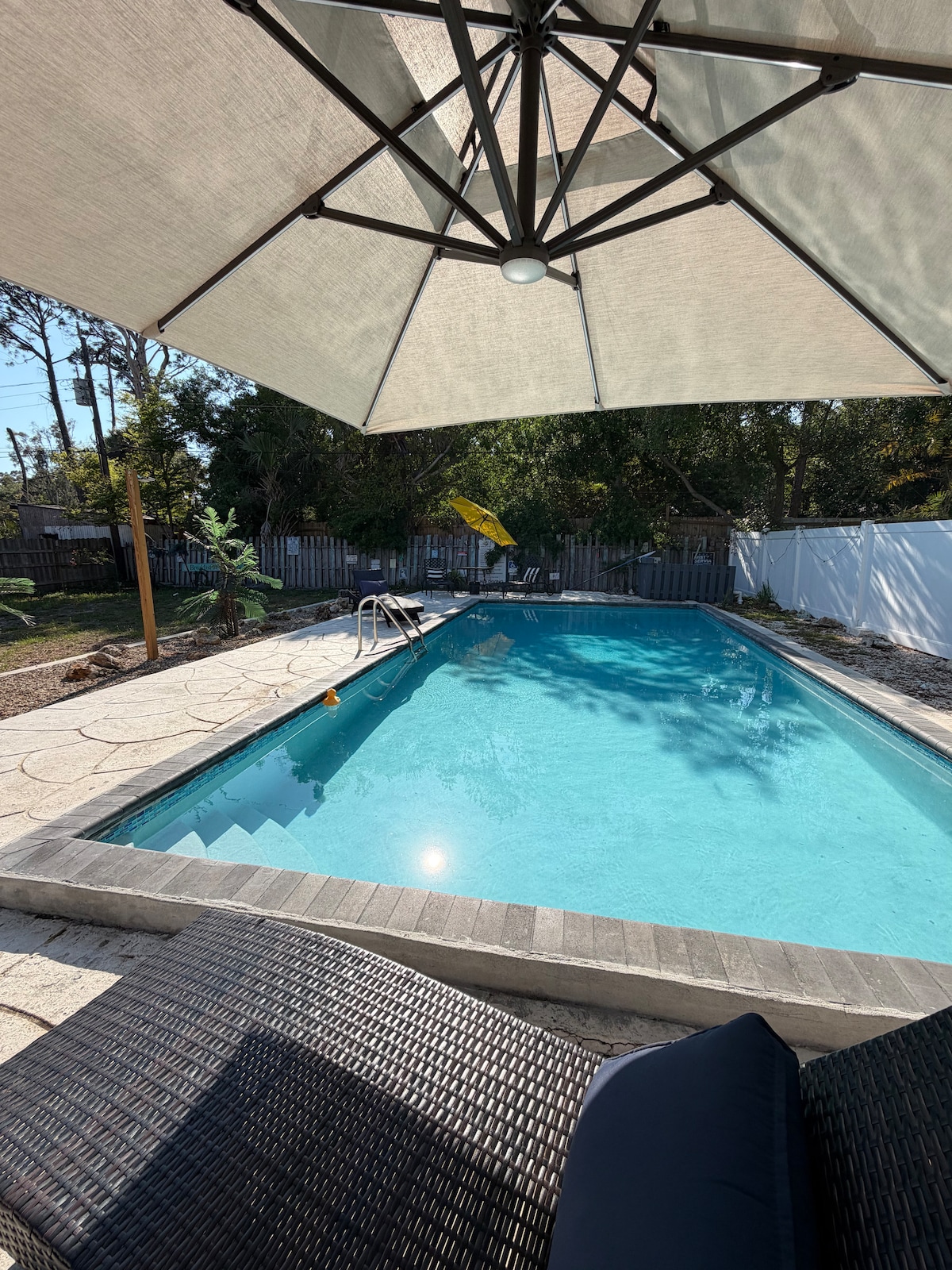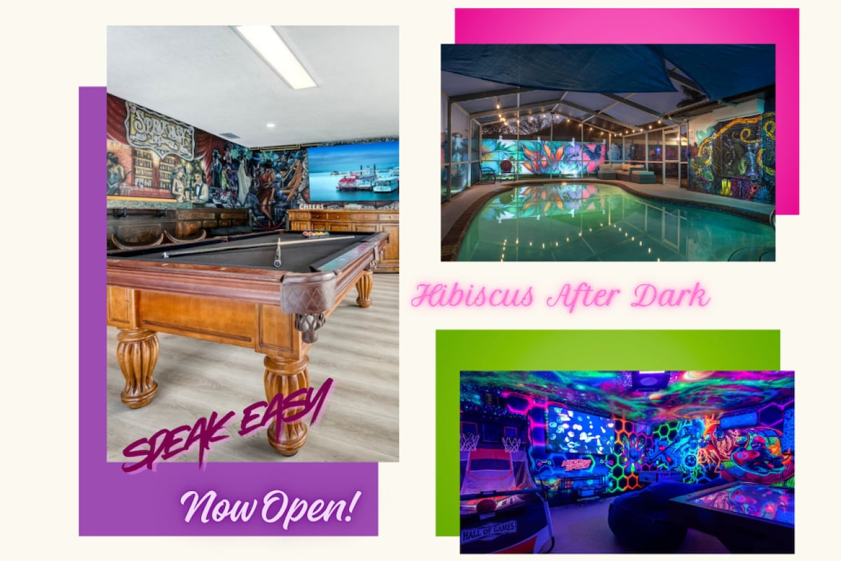 High end, luxury 3/2 pool home! 7 4k TVs w/ Netflix and cable (75" in living room), SONOS throughout house/pool, wifi, PS5, private heated salt water pool/Spa, putt putt, foosball, beach gear, Pack & Play, Game room (board games, billiards, shuffle board, arcade), massive kitchen/bar, washer & dryer, garage parking-- all in a quiet and safe neighborhood. Just 5 miles to the best beaches and restaurants. Entire home with no shared amenities!