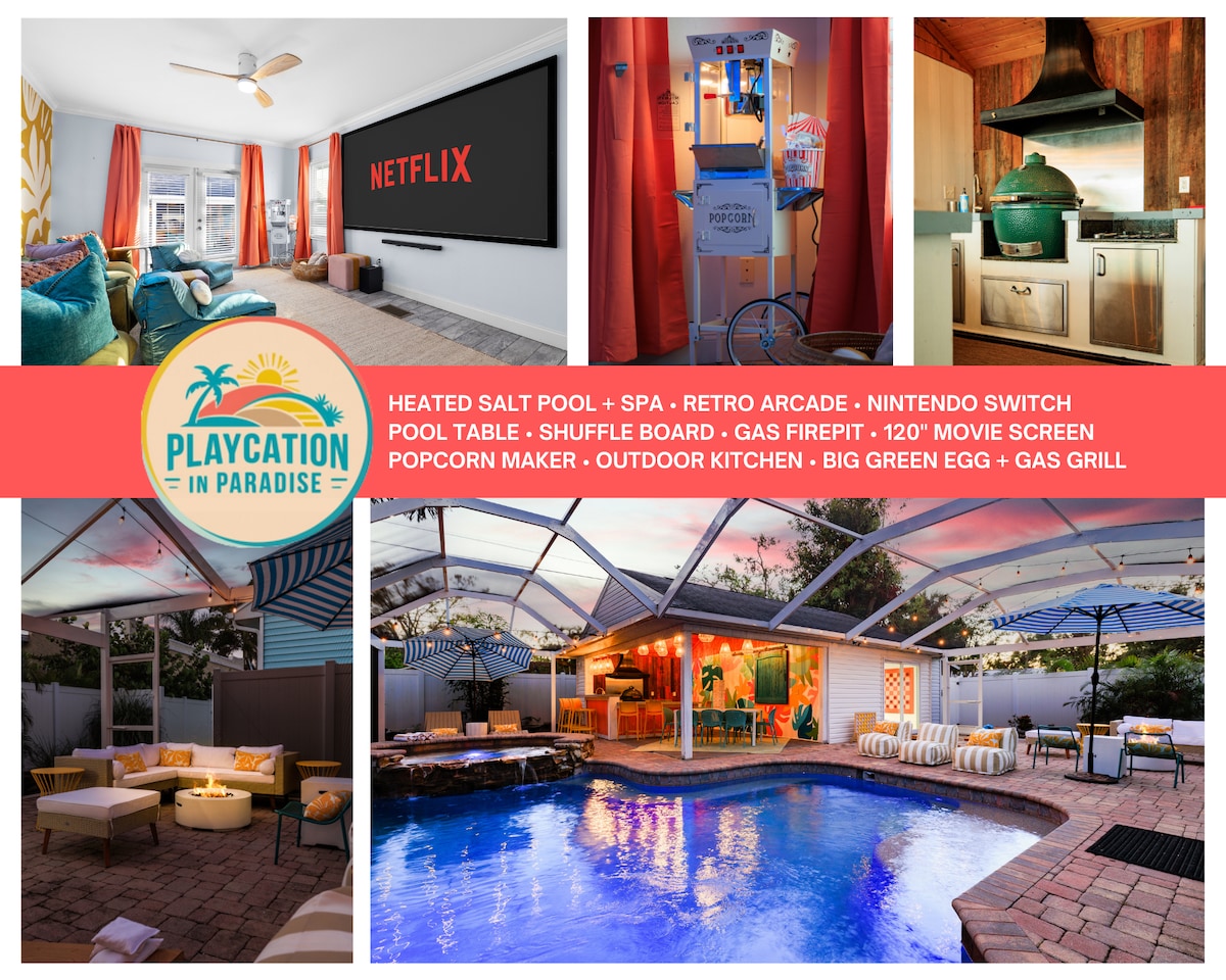 Welcome to Playcation in Paradise in Bradenton, just 15 minutes from Anna Maria Island. This 4-bed, 3.5-bath home features a heated pool, hot tub, outdoor kitchen w/BBQ smoker, firepit, and game room with arcade classics. Enjoy family movie nights on the 120” big screen or cook in the well-equipped kitchen. Bedrooms (K, K+Full Sofa Bed, 2Q, 2-Full Beds) with Leesa beds, and amenities like high-speed internet, beach gear, and a popcorn machine! Perfect for a relaxing, fun-filled Florida getaway!