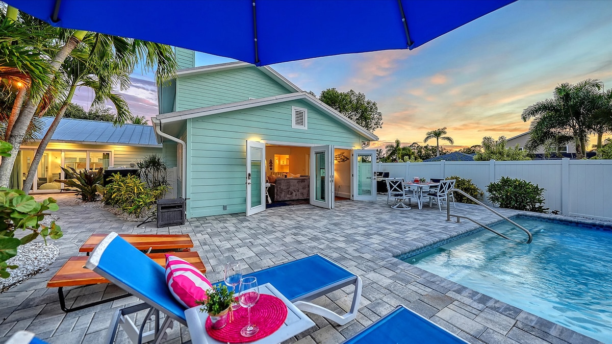 Private 3 bedroom single family home 4 miles to white sand gulf beaches Longboat Key and Anna Maria Island. HEATED SALTWATER POOL home with access to ride bikes to the beach. Spread out in the oversized backyard with your own private pool and sitting area, featuring artificial turf yard and putting green, and beautiful landscaping. All hurricane damage has been repaired. The fence is fixed and the backyard is again completely private. The pergola pictured in photos was lost in the storm.