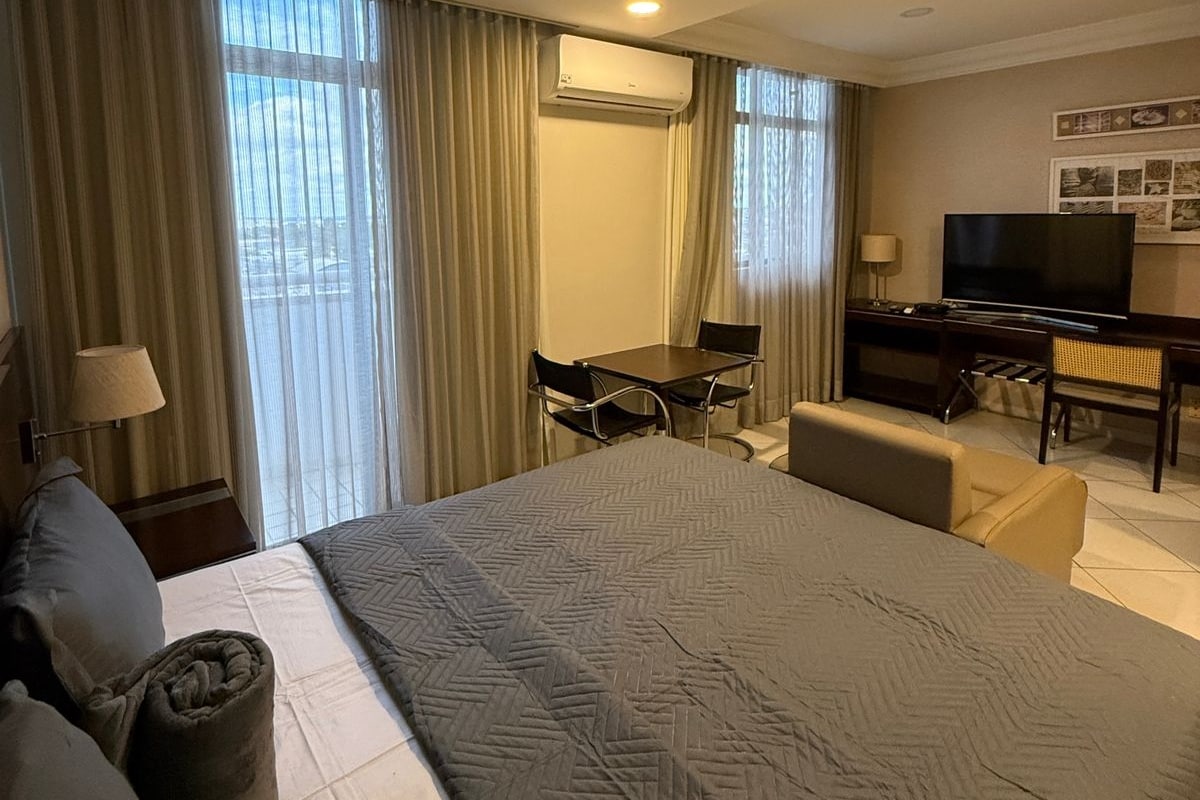 Flat no Tropical Executive Hotel bem projetado com linda vista para o rio. Quarto com ar-condicionado, uma cama queen Ortobom, lençol 1000 fios, TV 45”, wi-fi, mesa de jantar 2 lugares e sofá. Cozinha bem equipada com cooktop 2 bocas, depurador, purificador de água, cafeteira Dulce Gusto + cápsulas, panelas, liquidificador, geladeira, louças, utensílios de cozinha e microondas.