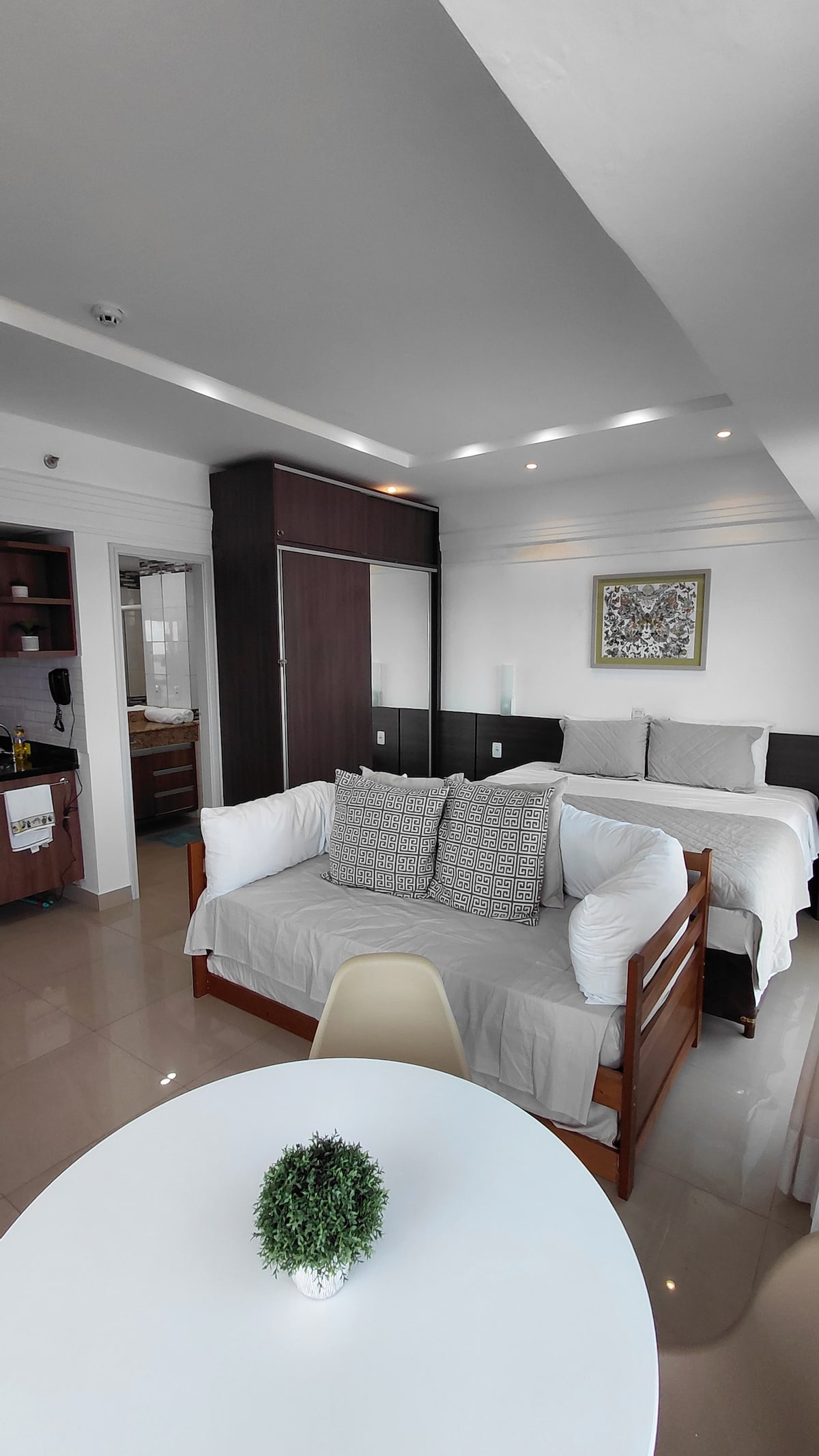 Apartment with a balcony facing the sunset and nature views, airy, peaceful, and secure. Always clean, with new and sanitized towels and bed linens. Equipped with Alexa, a fully furnished kitchen, and shared amenities including a swimming pool, barbecue area, changing room, party room, and game room. The neighborhood offers a nearby supermarket, walking area, gourmet square. The best option for those seeking convenience and proximity to the airport. Enjoy an incredible and unforgettable stay!