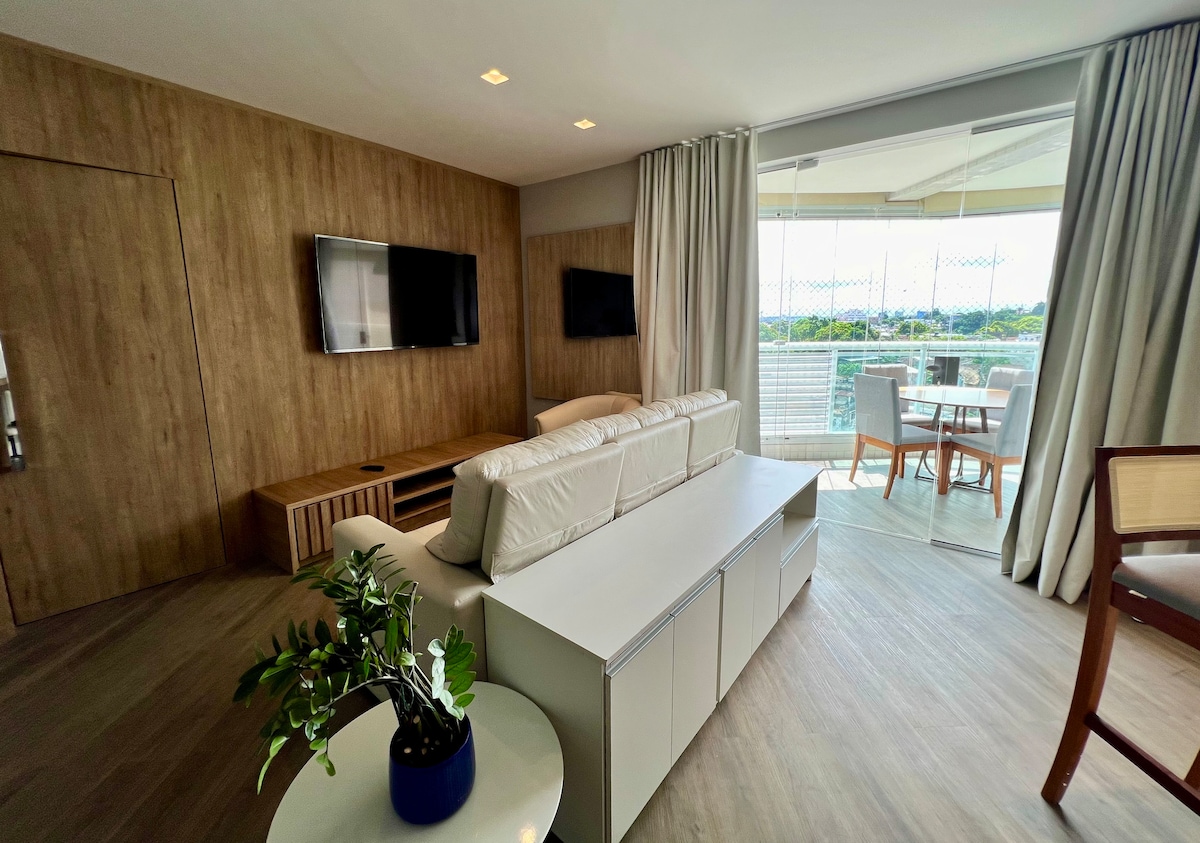 Apto com 1 suíte, cozinha, sala de estar/jantar, área de serviço e varanda gourmet. Suíte com ar, cama de casal e guarda-roupas. Cozinha com geladeira, fogão, utensílios domésticos e máquina de lavar. TV a cabo e internet, mesa de jantar, sofá e um colchão extra. Condomínio: 1 garagem, vagas para visitantes, lavanderia, salas de reunião, lan house, brinquedoteca, piscina com cascata, churrasqueiras, quadra, playground, academia com sauna e jacuzzi, jardins, espelhos d’água e conveniência