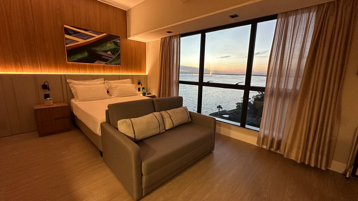 Relaxe neste espaço luxuoso e cheio de estilo. Tome banho de banheira apreciando o Rio Negro, com sorte poderá ver os botos pulando no rio. Vista para a praia da Ponta Negra, ponte e piscina. Prezamos pelo seu bem estar e conforto oferendo colchão, travesseiros, bem como roupas de cama e banho de alta qualidade.