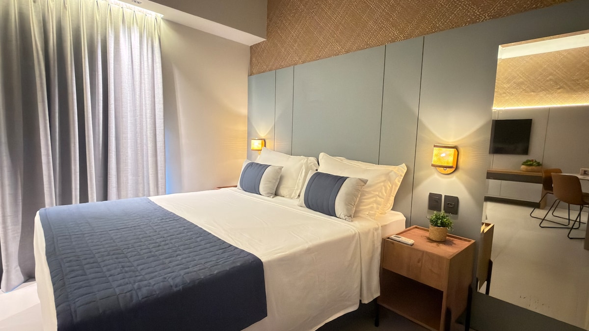 Flat Manaus Skyline Nosso flat une o conforto de um lar à estrutura completa de um hotel 4 estrelas, no coração de Manaus ✔ Suíte ampla e elegante, toda em porcelanato ✔ Vista deslumbrante para a Ponte Rio Negro ✔ Internet exclusiva + TV com streaming liberado ✔ Cozinha equipada com Nespresso, forno airfryer, geladeira e lava e seca ✔ Enxoval de cama, banho e louças 🎯 Diferenciais Piscina com vista 360º, academia equipada, sauna, restaurante, recepção 24h, garagem e loja de conveniência.