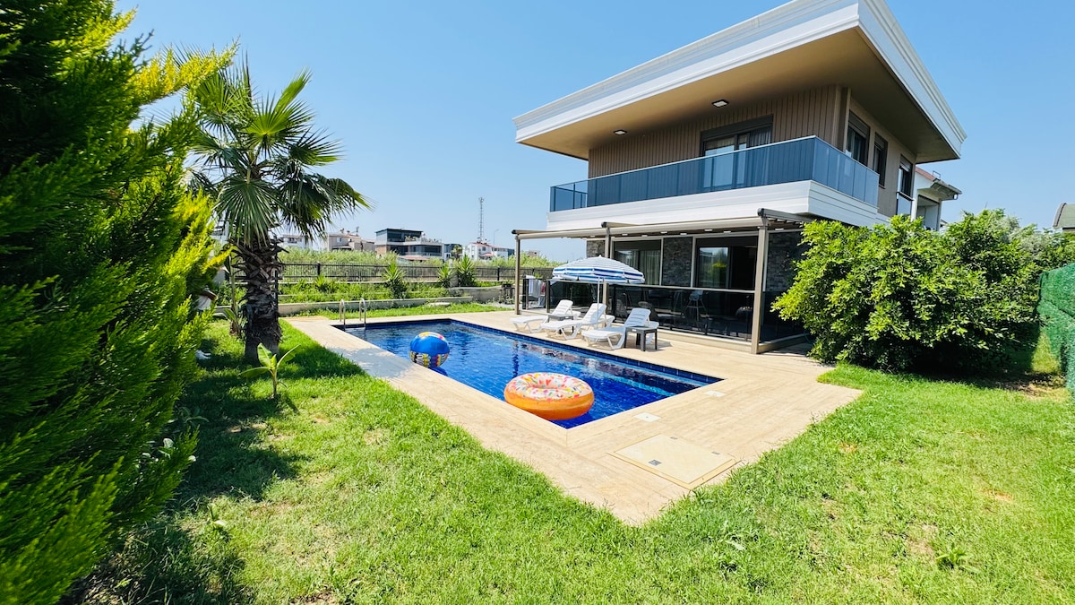 Bu harika yerde tüm ailenizle eğlencenin tadını çıkarabilirsiniz. Deniz manzaralı havuzlu 3 katli lüks villa da 3 tuvalet ve banyo ,2 mutfak ,8 kişilik yatak, 2 adet TV, çamaşır ve bulaşık makinesi bulunmaktadır. 900 metre yürüme mesafesinde denize ulaşabilirsiniz. Araç park yeri vardır.