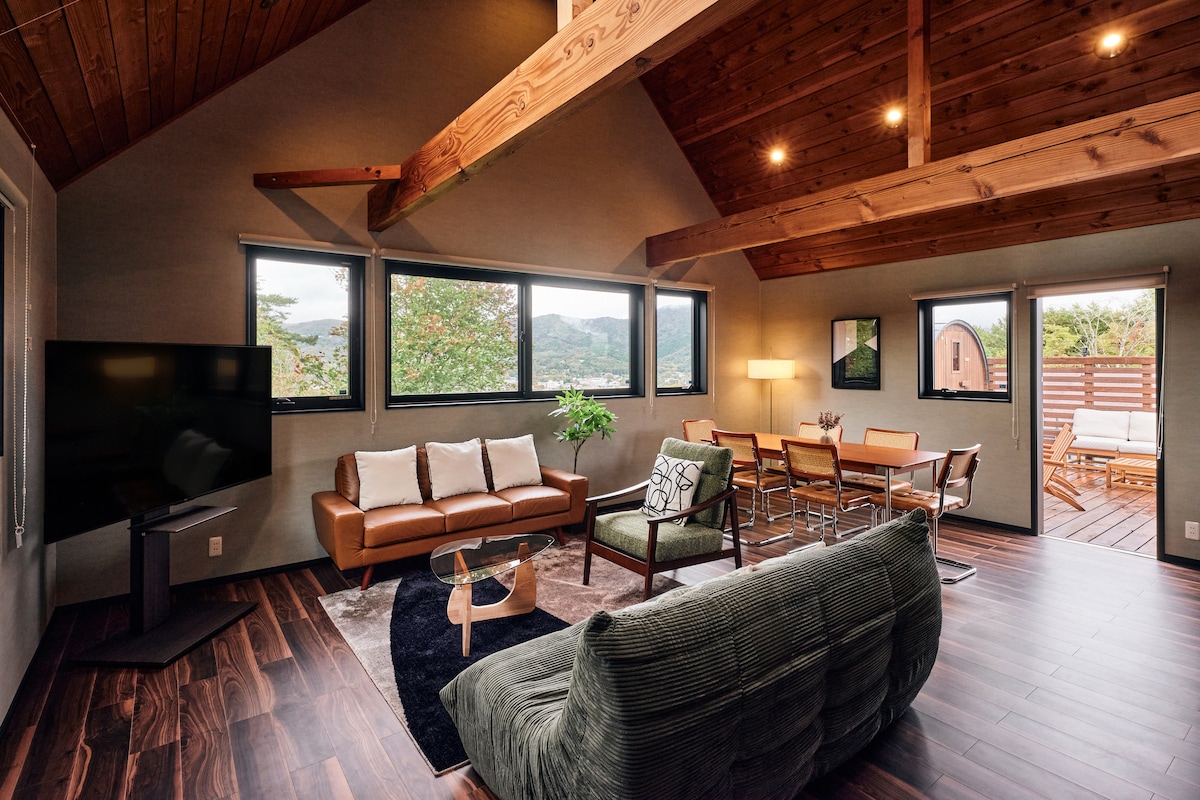 ■宿のご紹介 心地よいデザインと温泉の恵みが融合した宿へようこそ 周囲を木々に囲まれたプライベート空間で、家族やグループ旅行に最適です。 和室も完備しており、小さなお子様連れのご家族にも安心です。 BBQ・焚き火スペースが1Fピロティスペースにあり、自然に囲まれながらも雨の心配をすることなくお楽しみいただけます。サウナが直結しているので、そのまま汗を流しに向かい、湯上がりにまた風に当たることも可能です。 リビングスペースは床暖房完備のため、寒い時期でも快適にお過ごしいただけます。 ■主な設備 ・フルリノベーション:プロのデザイナーによる洗練された内装 ・温泉:美肌効果のある二ノ平温泉を堪能 ・BBQ設備:本格BBQグリルを完備 ・焚き火スペース:夜は焚き火を囲んでリラックス ・プロジェクター:大画面で映画を楽しめます ・サウナ & 水風呂:ロウリュ可能なサウナと水風呂完備 ・和室:畳の和室で和の雰囲気を堪能 ・子ども設備:ベビーチェア、子ども用食器、布団、おもちゃ等をご用意