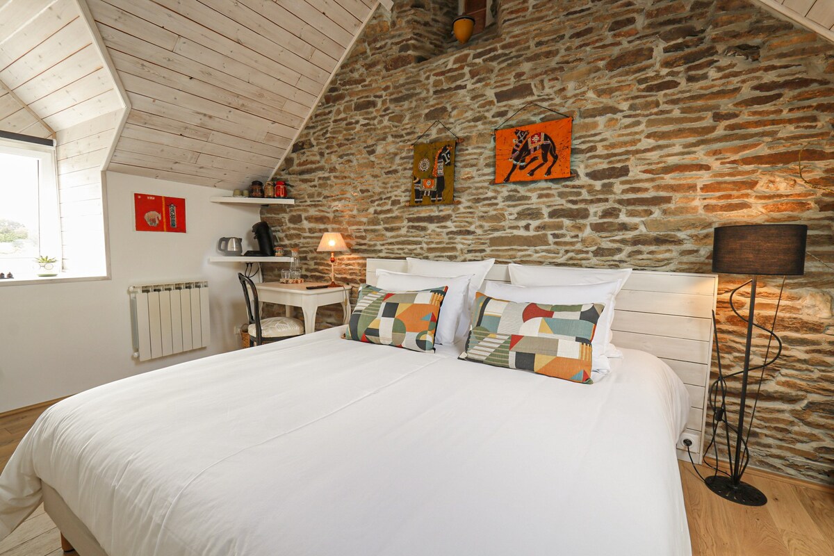 Belle Chambre agréable aménagée avec goût (ancien monastère du XVII eme) avec porte d'entrée indépendante de la maison. Située à la campagne et proche de belles plages et de chemins de randonnées (dont le GR223). La salle de bain privative possède une grande douche et une grande baignoire. Accès à une jolie terrasse extérieure.