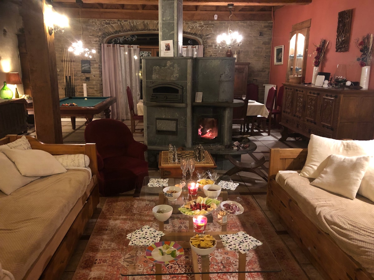 Demeure de caractère entièrement à votre disposition ainsi que le jardin de 3000 m2, avec 6 chambres, spa extérieur 6p utilisable en toutes saisons car chauffé à 36°, avec très belle vue sur la campagne sans vis-à-vis, salon cathédrale, cinéma grand écran, billard salle de jeux et babyfoot, dans un environnement très calme et 15 km de la mer. Idéal pour vacances familiales en été et en hiver. Jardin 3000 m2, vélos , piscine hors sol non chauffée, table ping pong et nombreux jeux à disposition.