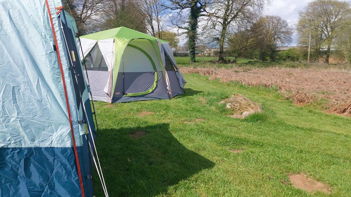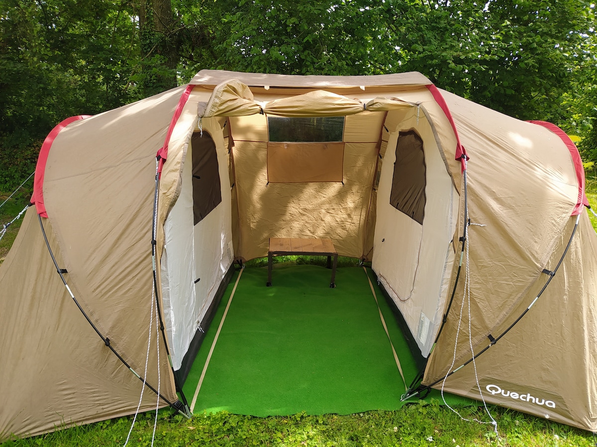 Dans un petit camping minimaliste, nous mettons à votre disposition cette tente. N'accueillant que 5/6 tentes sur le terrain, vous pourrez profiter du calme et de la nature de l'aire d'accueil. La tente est louée avec deux matelas pneumatiques (nous vous mettons à disposition une pompe si besoin). L'espace central est isolé du sol pour permettre de stocker vos sacs. Nous mettons également à disposition une salle hors d'eau dans laquelle vous pourrez lire, jouer au ping-pong ou manger à l'abris.