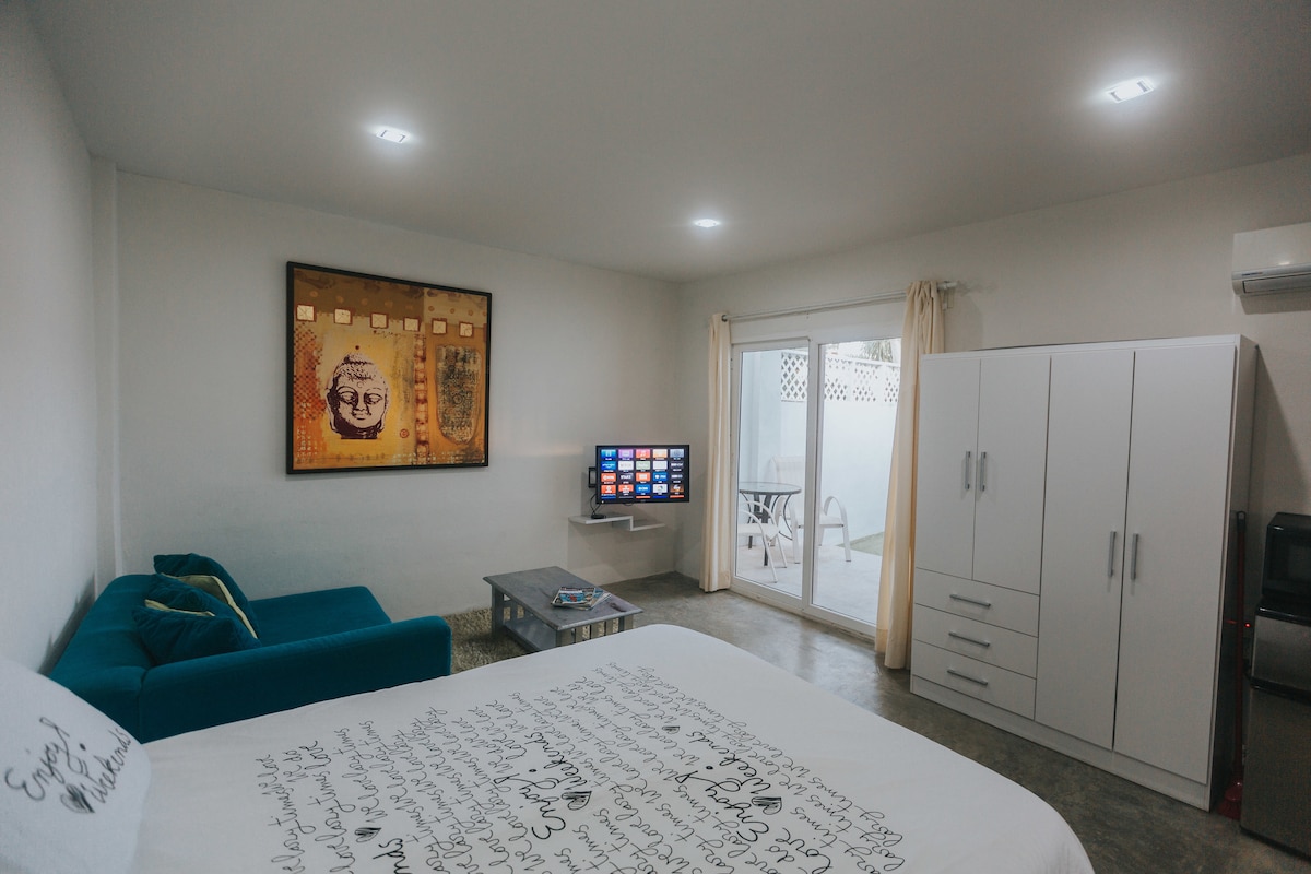 This beautiful studio reflects Aruba's blue colours with a very Modern and CLEAN design, offering a very comfortable KING size bed & King size pillows, a fully functional kitchen, beautiful walk-in closet, modern bathroom with a spa like Rainfall shower. Located on the highest floor of the building with a stunning view of downtown Aruba as well as the harbour! Enjoy the infinity pool and rooftop hot tubs with 360 view and state of the art gym overlooking the water and cruise ships!