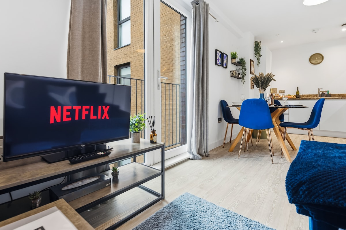 Discover contemporary living in this spacious two-bed apartment, ideal for business travellers, couples, and families! Enjoy riverside views and a private terrace. The open-plan living area features a fully equipped kitchen & sleek décor. Free parking, two plush beds, high-speed WiFi, a dedicated workspace, and a huge 80-inch TV! Located just moments from Chapel Street’s top restaurants, cafes, and cultural sites, this apartment offers comfort and convenience for your stay in Manchester.