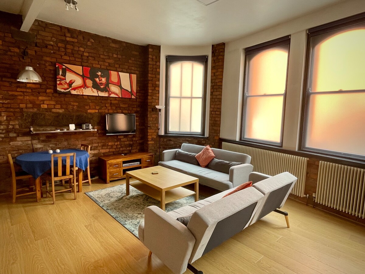 Spacious 2 bedroom, 2 bathroom warehouse conversion loft apartment • Large living & dining areas with original features • Large bedroom with euro king bed & luxurious ensuite • Second bedroom with double bed • Entertainer's kitchen with Miele appliances • Bathroom with sunken bath • Fast wifi, 55" OLED TV with Netflix • Off-street parking for 2 cars included 2 minutes walk from Deansgate tram & train station Close to HOME Manchester, Spinningfields, Gay Village & Northern Quarter