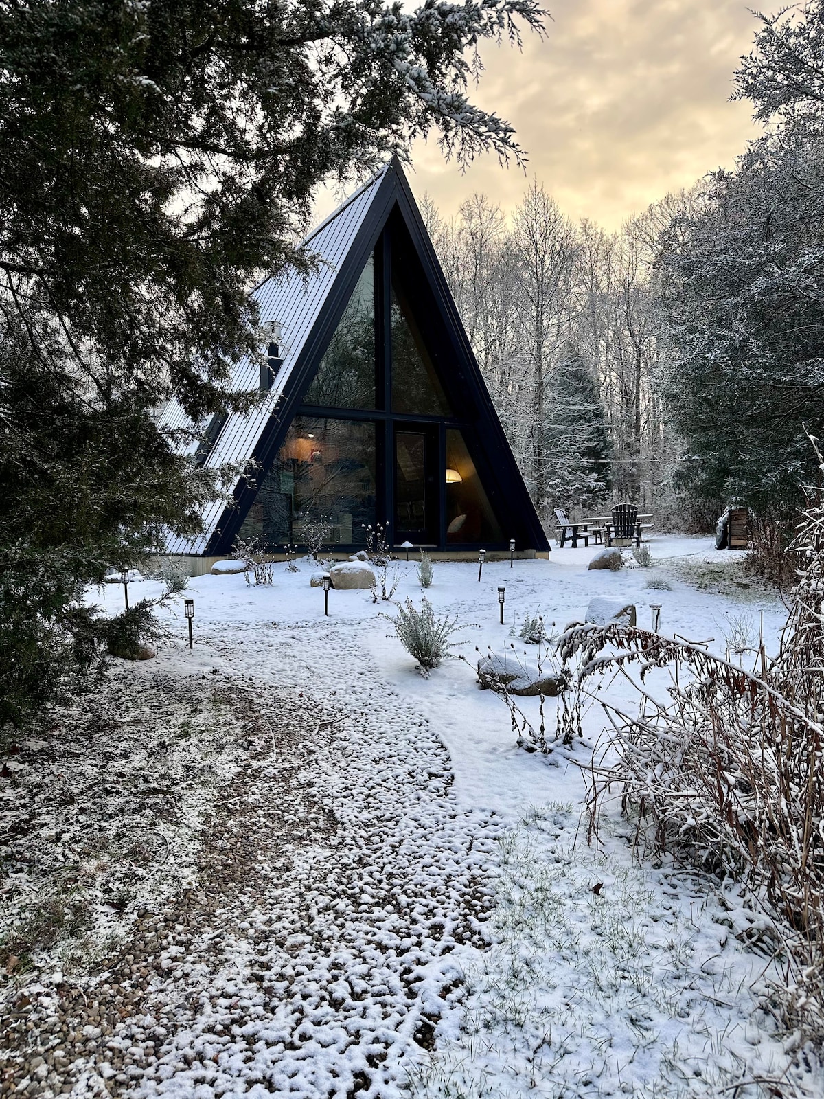An A-Frame designed and built by architect Jose Garcia in a peaceful and private setting in Adams County, Ohio. Rest, relax, and recharge while walking the trails on our 20-acre wooded property or fill the heated outdoor cedar soaking tub with fresh water for a relaxing soak. Visit the nearby Serpent Mound, Amish country, or nature preserves. Wildflowers in the summer, cozy Nordic fireplaces during the winter, and star gazing on clear nights, Solstice Haven is the perfect year round retreat.
