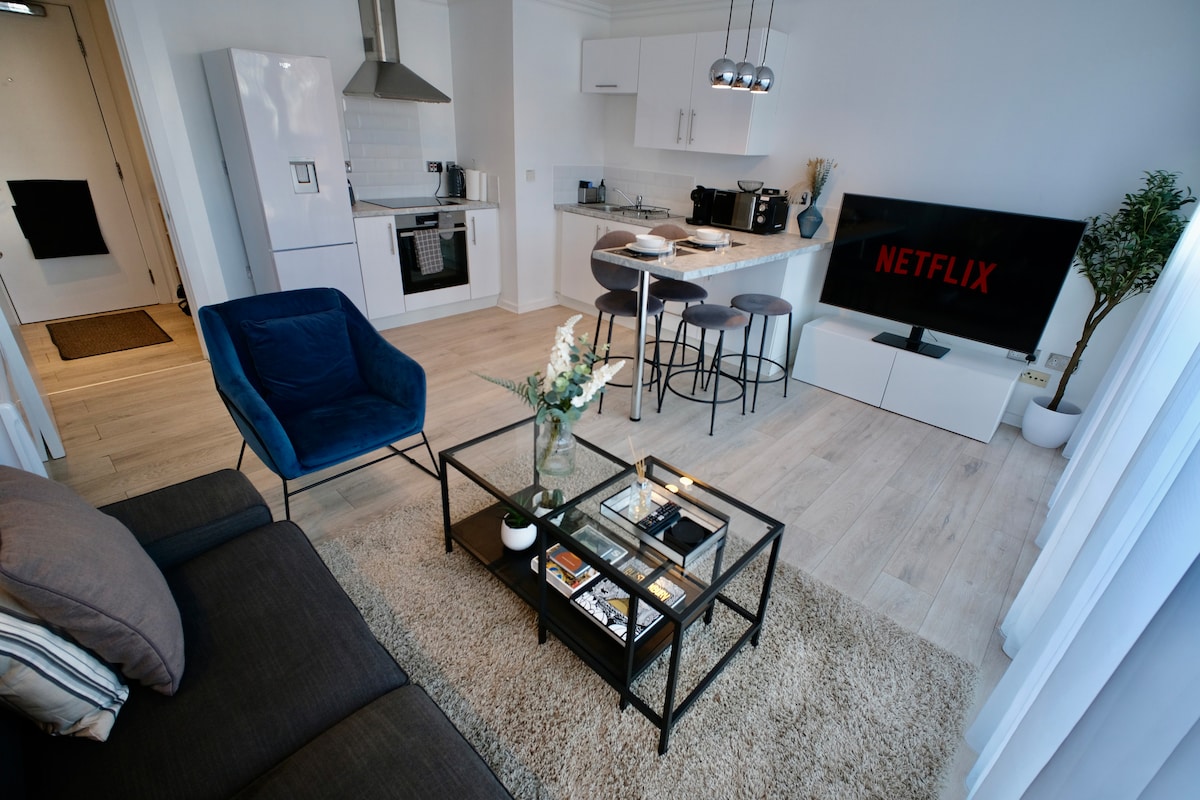 A stylish one-bedroom apartment with a 22kw electric car charger on its private parking area right outside the door! It offers comfortable accommodation for 2/4 guests with either a king-sized bed (or two single beds), providing flexibility for sleeping arrangements, and a sofa bed in the living area. Conveniently located with a coffee shop opposite -perfect for breakfast- and walking distance to shops and restaurants.We accept max 2 dogs at a charge of £20 per dog per stay payable to the host.