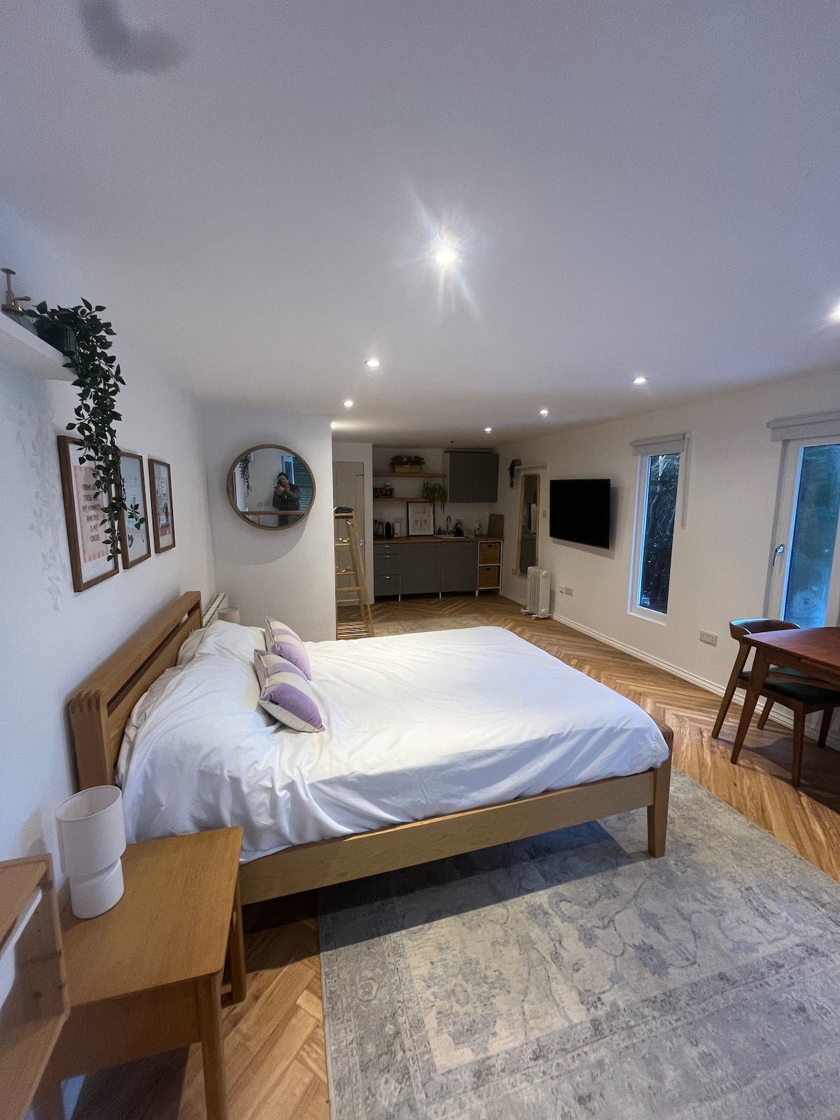 Nicely presented garden pod. Double bed for comfort. Tea/coffee making facilities. Heated. Storage space. TV. Bathroom/shower facilities in the main house.The property is within easy reach of local takeaways, delivery services which is ideal for the short stayer. Therefore ruse if the kitchen is not permitted for short stay guests.