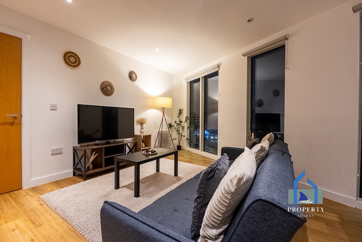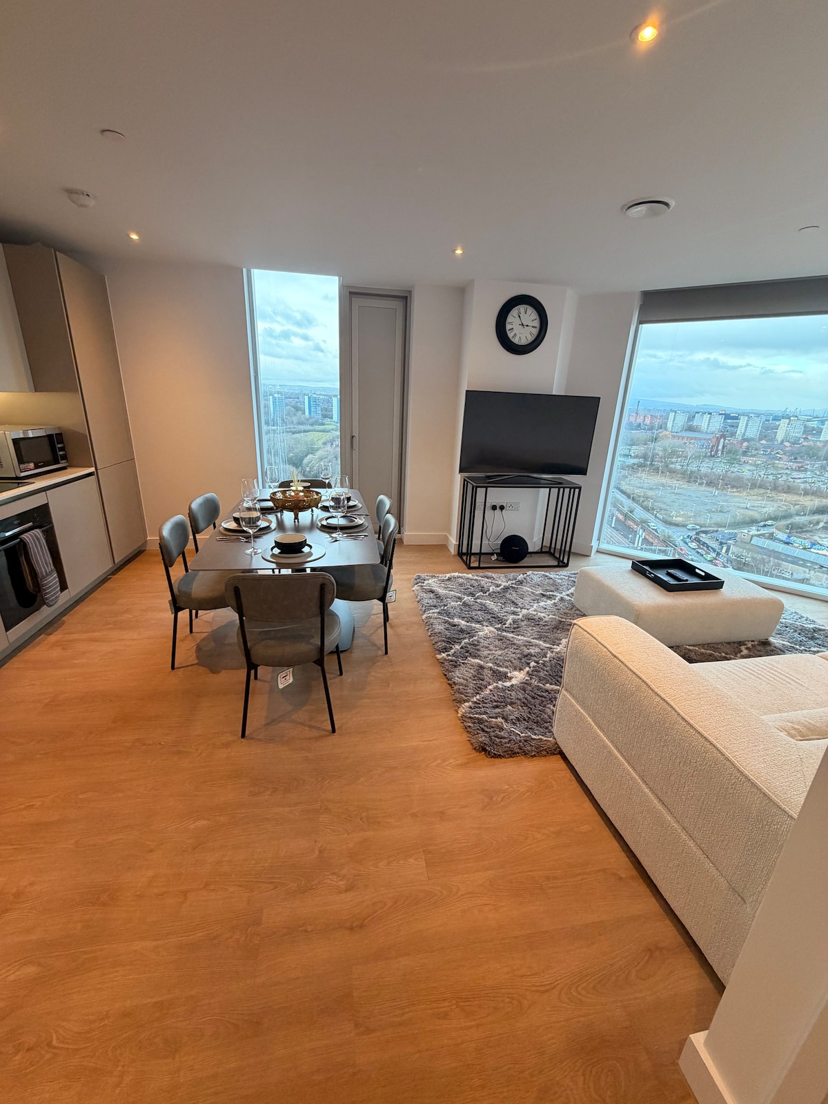 Welcome to our stylish, vivacious two-bedroom apartment with a breathtaking view of Manchester's north. The interior of the apartment has been tastefully decorated, featuring modern furnishings and all the conveniences needed for up to 4 visitors to have an opulent and comfortable stay in Media City. This house is the ideal retreat. We will ensure your stay is as pleasant as possible whether you are working away from home or staying for a weekend.