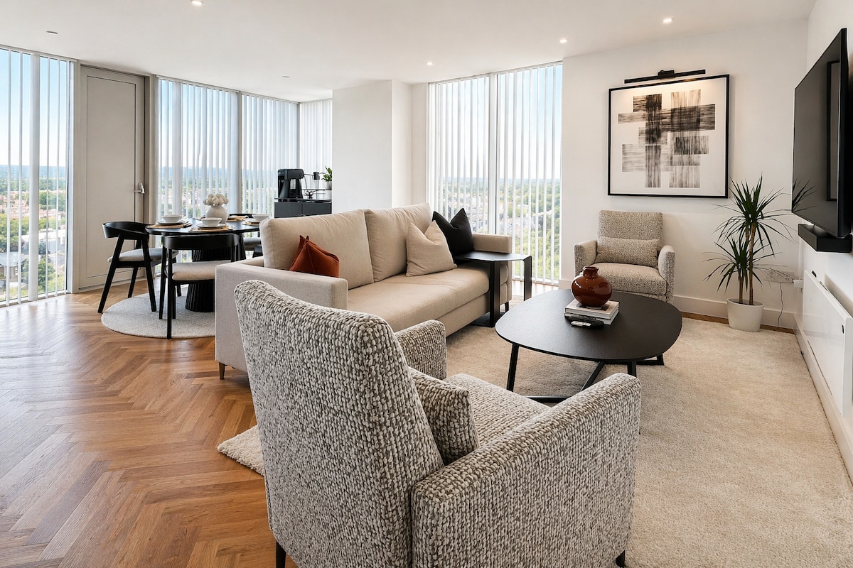 “Even better than the photos”, guests love the panoramic skyline views, spotless interiors, and hotel-level comfort. Luxury high-rise apartment in prime Deansgate with two king bedrooms (one en-suite), two bathrooms, workspace & fully equipped kitchen. Walk to Spinningfields, Castlefield & Deansgate station. Ideal for business, families & extended stays. Fast WiFi, Smart TV, coffee machine. Weekly & monthly discounts available.