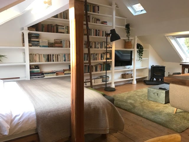 Self contained, stylish, loft apartment with en-suite, kitchen and wood-burner on the top floor of private house in a green, leafy area of Withington, south Manchester. Wi-fi, smart TV, super-king bed, good quality bed linen, fully stocked kitchen with dishwasher . Five minute walk to all amenities including frequent, 24hr bus service to city centre; 15 minute walk to tram stop (to Old Trafford or the Etihad); 12 minute walk to train station to airport or city centre. On-street parking.