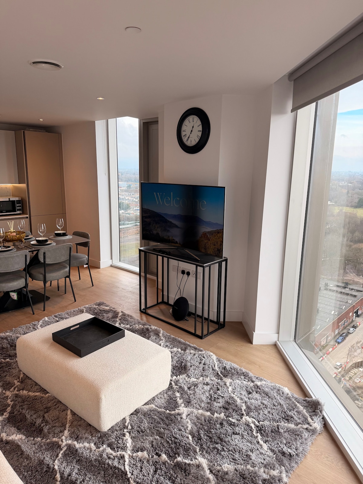 Discover contemporary living in this spacious two-bed apartment, ideal for business travellers, couples, and families! Enjoy riverside views and a private terrace. The open-plan living area features a fully equipped kitchen & sleek décor. Free parking, two plush beds, high-speed WiFi, a dedicated workspace, and a huge 80-inch TV! Located just moments from Chapel Street’s top restaurants, cafes, and cultural sites, this apartment offers comfort and convenience for your stay in Manchester.