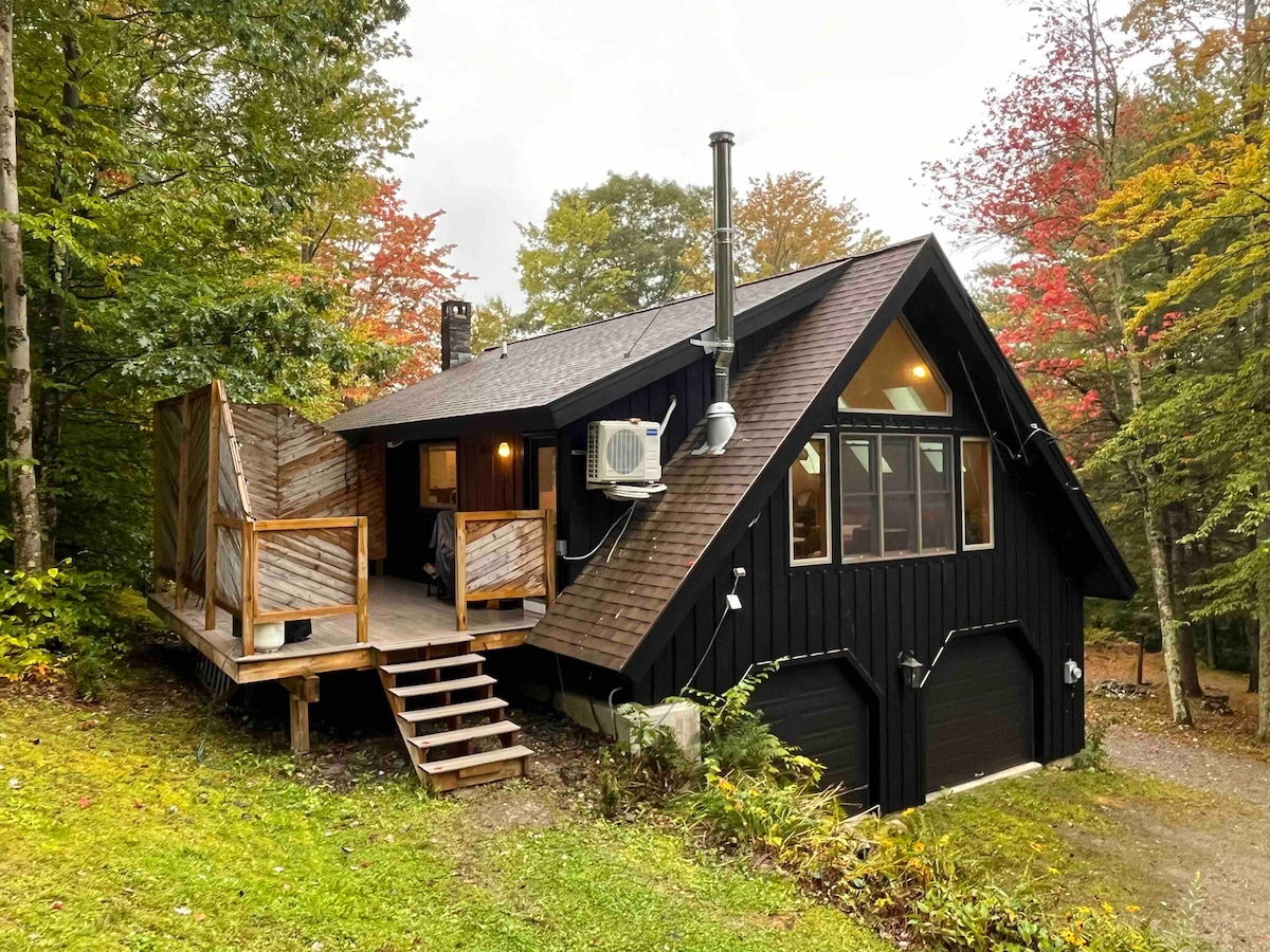 Escape to Stratton Chalet, 5 mins from a pristine swimming pond, featuring a new hot tub and barrel sauna with incredible Stratton mountain views. Recently renovated, Stratton Chalet features a large stone fireplace, outdoor, modern fire-pit area, two outdoor decks, contemporary outdoor furniture, Bose soundbar, and a well-equipped kitchen.