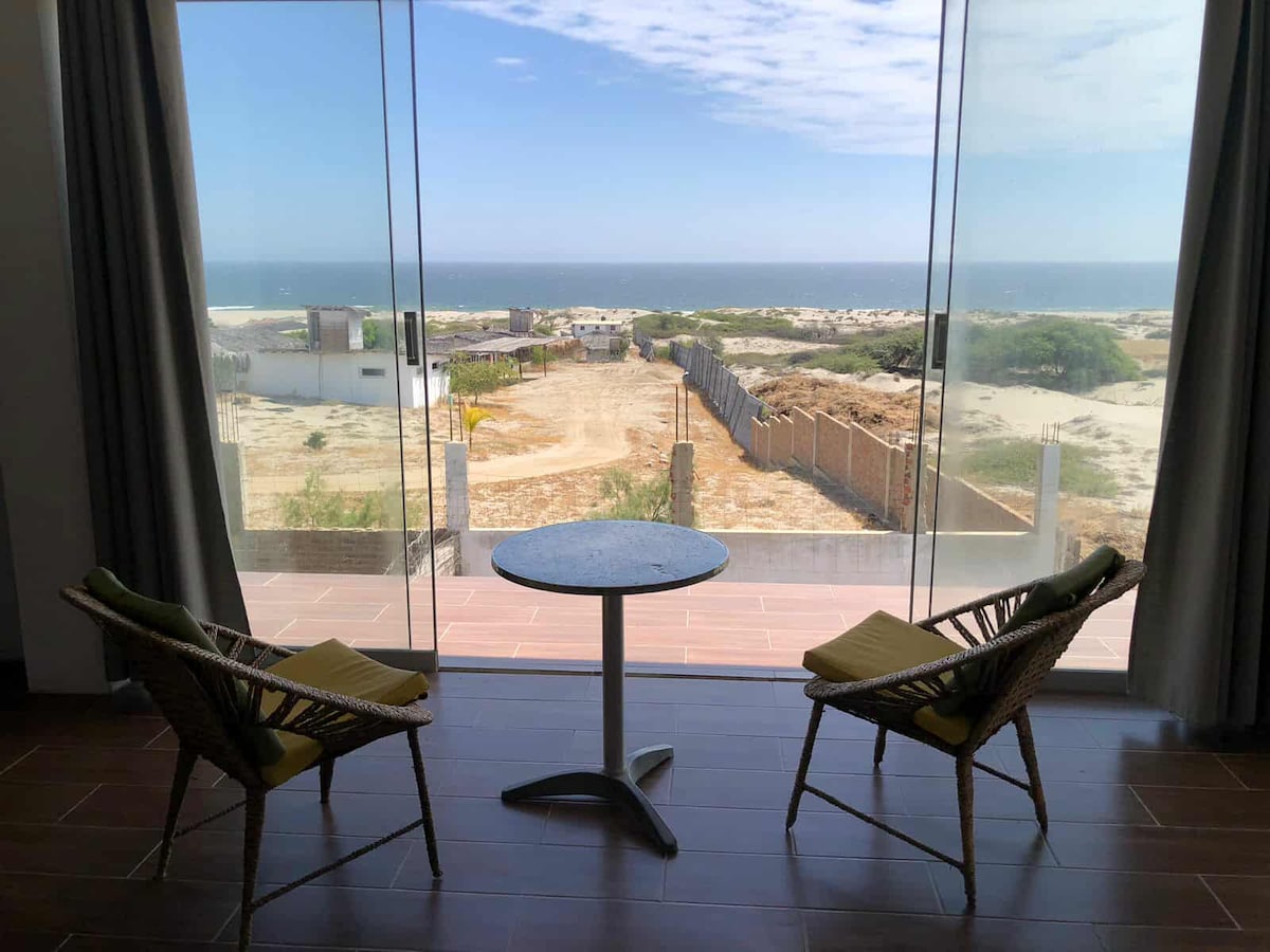 Cozy Suite at ocean shore right at the beach Las Pocitas, with private access to the beach, the most exclusive area in Mancora. 50 m2 suite, own private space with beautiful palms and gardens, plenty of places to relax. Suite with a king size bed, big flat tv, optic fiber internet, fan, a little kitchenette station( coffee machine / sandwich grill and minibar ), big terrace, with stunning views to the ocean, and sun-loungers at your beach.