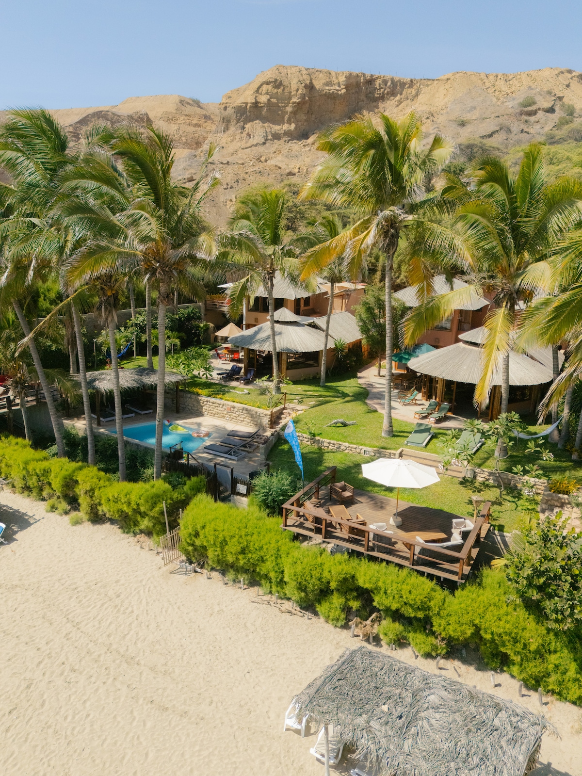 En primera fila de playa. Arquitectura imponente inspirada en los templos preincas y su tecnología, en el vuelo de la aves y el viento, en su diálogo eterno con el sonido del mar. Combina una estructura moderna con acabados naturales: madera, piedra, eucalipto, bambú y troncos vivos; rodeada de un jardín tropical. Ubicada en Vichayito, colindante a Máncora, votada la mejor playa del Perú.