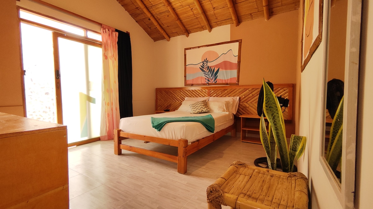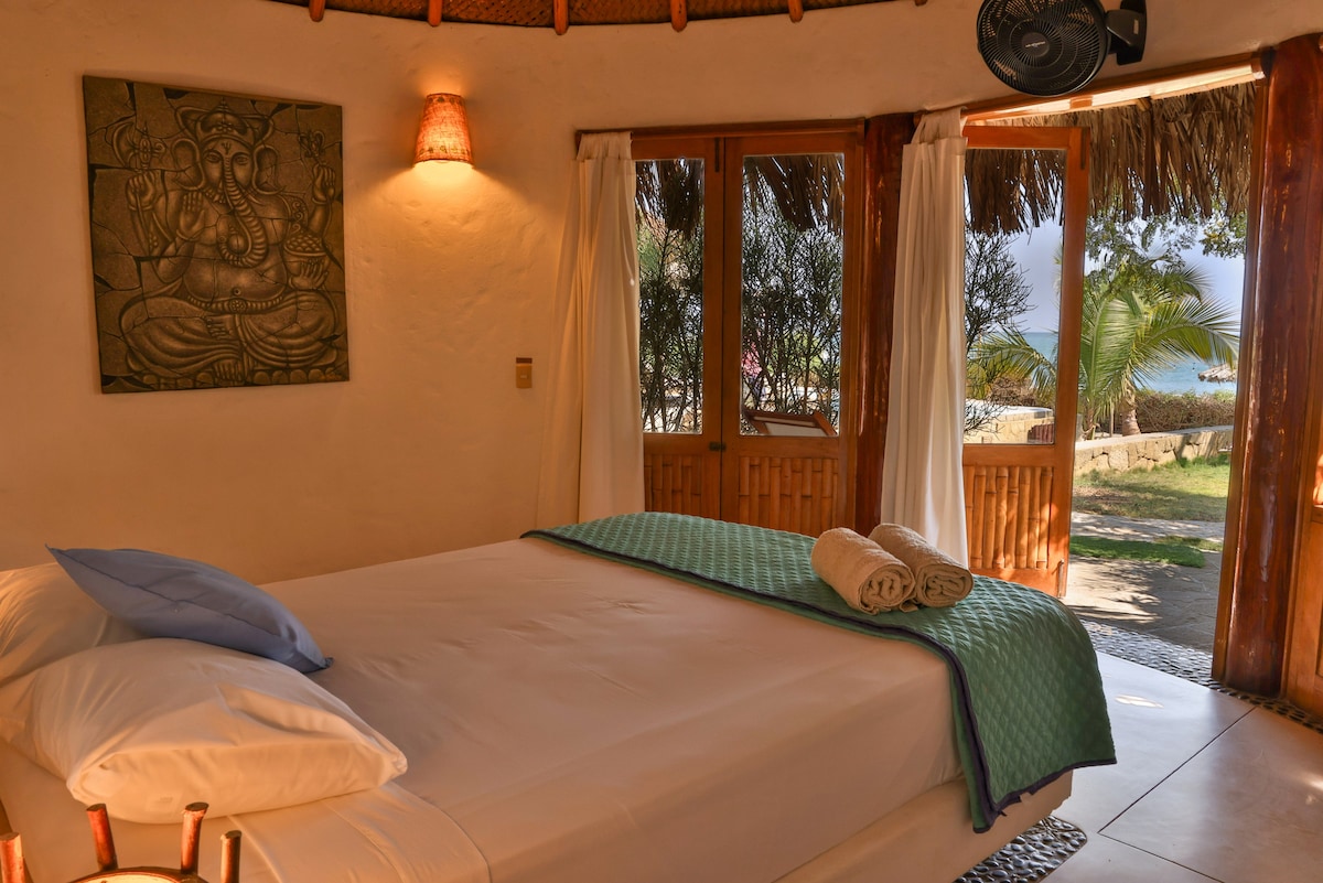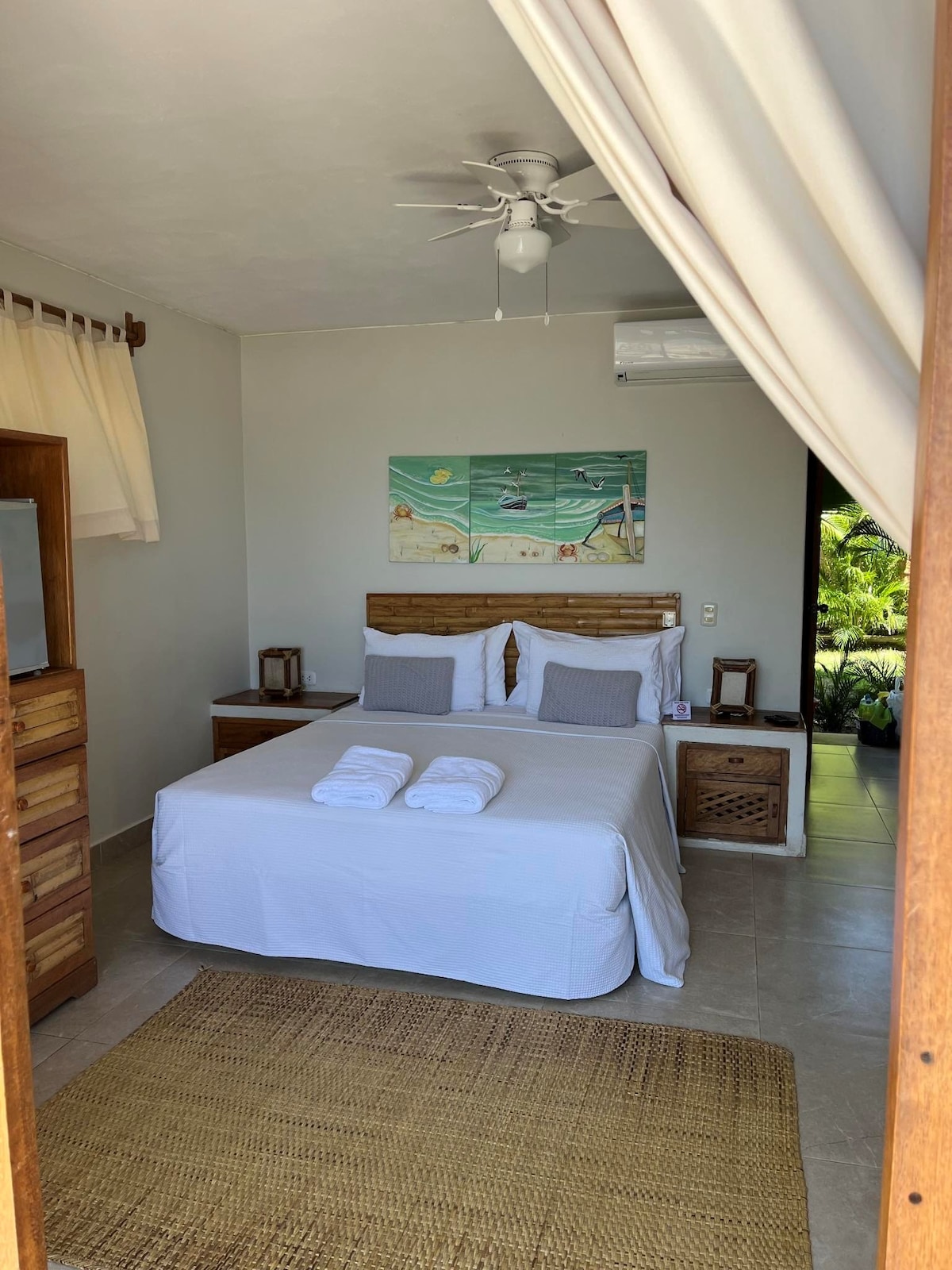 Nuestro Bungalow Queen tiene de una ubicación privilegiada con vista al mar y al jardincito que tiene al frente de su terraza privada. Este espacio rústico y acogedor cuenta con una cama Queen size y ventilador, garantizando una estancia cómoda y relajante con todos los amenities necesarios.