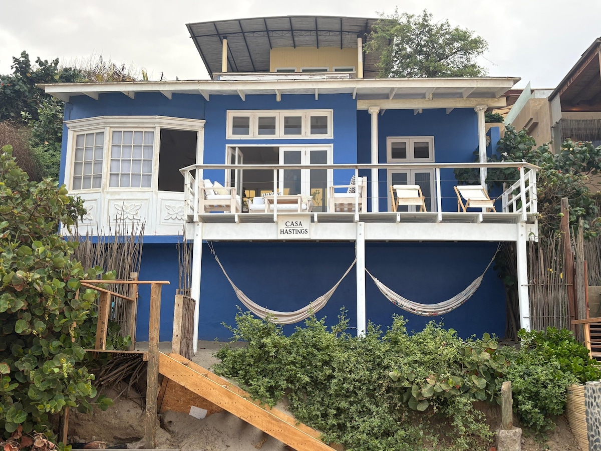 Acogedora casa rodeada de áreas verdes, de uso exclusivo para los huéspedes sin áreas compartidas, a sólo 50 metros de la playa y a 5 minutos caminando al surf point, tiendas, restaurantes y demás lugares turísticos. La casa tiene dos habitaciones grandes con una cama queen en cada habitación y dos baños con agua caliente. Cuenta con una sala y cocina completamente amoblada. El exterior tiene jardín, terraza y comedor.