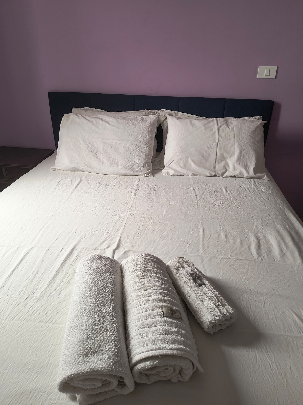 “中心公寓,3间客房,1个停车位,无线网络,空调和婴儿床”