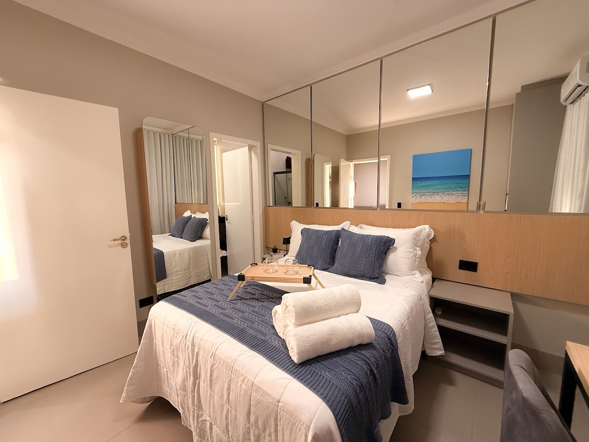 Apartamento completo, tranquilo, aconchegante e seguro! Todo mobiliado e equipado para garantir uma ótima experiência em sua estadia. Temos ar condicionado, roupas de cama e banho, internet wi-fi rápida (fibra ótica) e TV Smart. Um cantinho agradável preparado com muito carinho pra você! O edifício possui elevador, câmeras de segurança, vaga de garagem coberta e acesso seguro para pedestres e automóveis.
