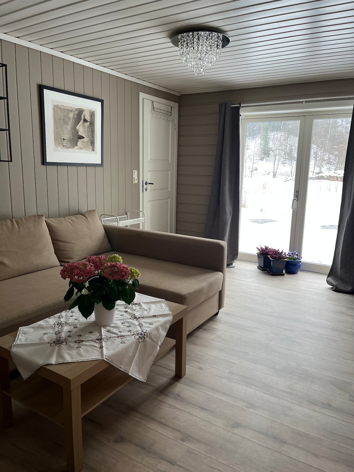 Koselig leilighet med egen terrasse og god utsikt. Leiligheten har en romslig stue og et eget bad med dusj. Det er et soverom med en god og myk dobbeltseng. I stuen finnes en dobbel sovesofa, og ved behov kan vi ordne en ekstra seng. Vasket og strøket sengetøy samt håndklær er inkludert i prisen. Vi forventer alminnelig folkeskikk og at ingen andre beboere og naboer skal bli forstyrret etter kl. 23. Vi bor selv i huset i 2 etasje.