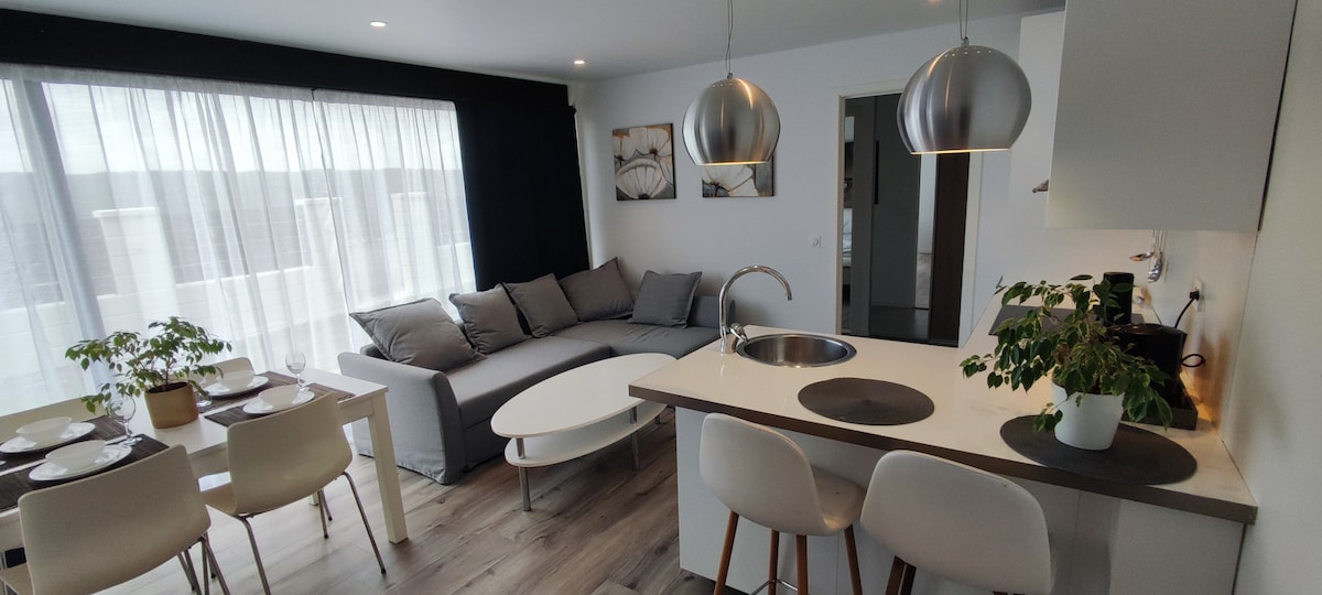 Velkommen til en familievennlig, lys og moderne leilighet på 65 m² ytterst på piren i Mandal! Bare 100 meter til Sjøsanden og kort vei til Furulunden med turstier, strender og lekeplasser. Fem soveplasser fordelt på to soverom, åpen stue/kjøkkenløsning og solrik balkong med sjøutsikt. Fullt utstyrt kjøkken, vaskemaskin, WiFi og TV. Kort gangavstand til sentrum med kaféer og butikker. Passer godt for familier eller par som ønsker en avslappende ferie.