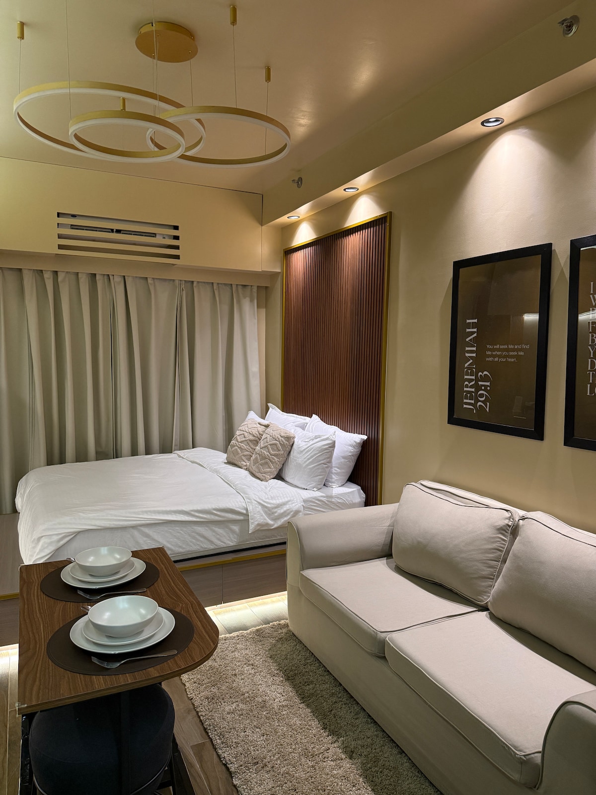 •Modern hotel-style living at Premier SMDC Fame Residences, Mandaluyong • 24.20 sqm fully furnished unit with comfy bed, aircon, fast Wi-Fi, Smart TV with Netflix, and karaoke • Features a hot/cold shower and a functional kitchenette • Access to amenities like the swimming pool and 24/7 security • Prime location: walkable to SM Megamall, MRT-3 Shaw, and Shangri-La Plaza • Minutes away from major CBDs: BGC, Ortigas, and Makati • Ideal for business trips, staycations, and remote work