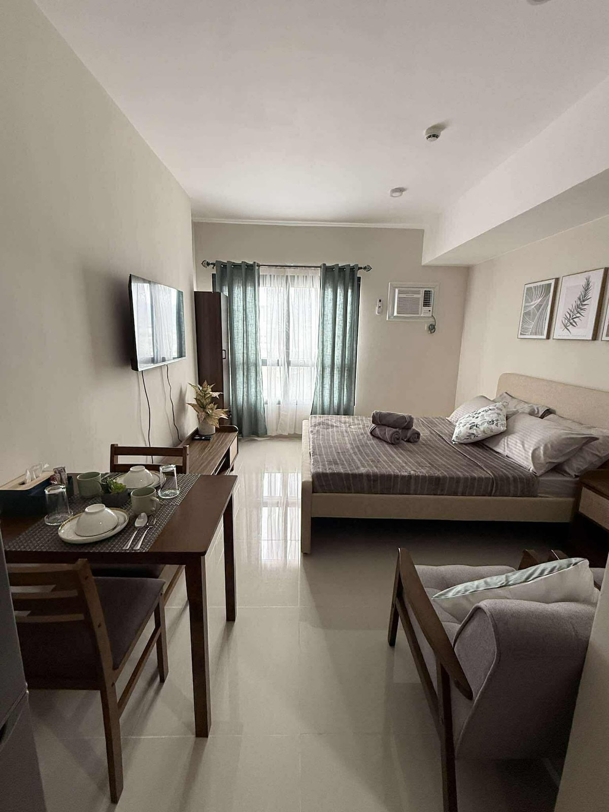 A modern studio in the city center with a clean and comfortable design, ideal for both short and long stays. Located just steps from the mall, with easy access to shopping and dining. • 1-minute walk to the mall • Fast WiFi + Google TV with HBO Max • High-floor city / partial sea view • Equipped kitchen • Swimming pool access • Digital lock, self check-in • Queen bed + sofa bed Window-type AC; minor sound variation. 22–23°C recommended.