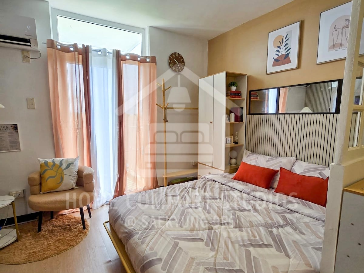 Kick back and relax in this calm, stylish studio unit near Mactan-Cebu International Airport! Inclusions: - Free access to the Pool and Gym - Towels and toiletries - Complimentary Coffee - Hairdryer - Clothes iron - Extra bed linens (upon request) - Wi-Fi About our space: - Pet-friendly - 32 sqm with a balcony facing the pool - Queen-sized bed with 2 bedside outlets - Work desk - Hot and cold shower - Dining area - Smart TV with Netflix - Wardrobe - Kitchen - Washing Machine